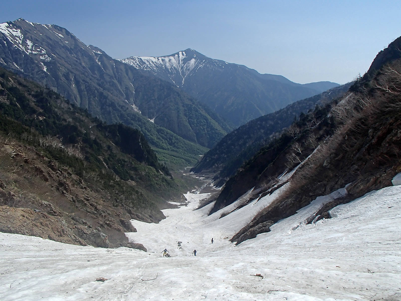 13時53分、雪渓末端まで滑ってきました。