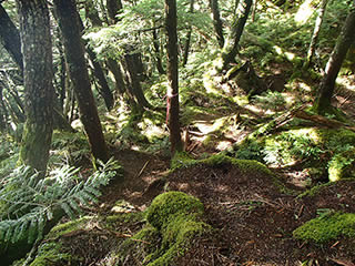この先で少し開けた場所に出るのですが、マーキングが見つからずに進む方向に少し迷って右往左往(^^;。一番最初に進みかけたこの方向が正しい方向でした。森に入ると踏み跡がはっきりしました。