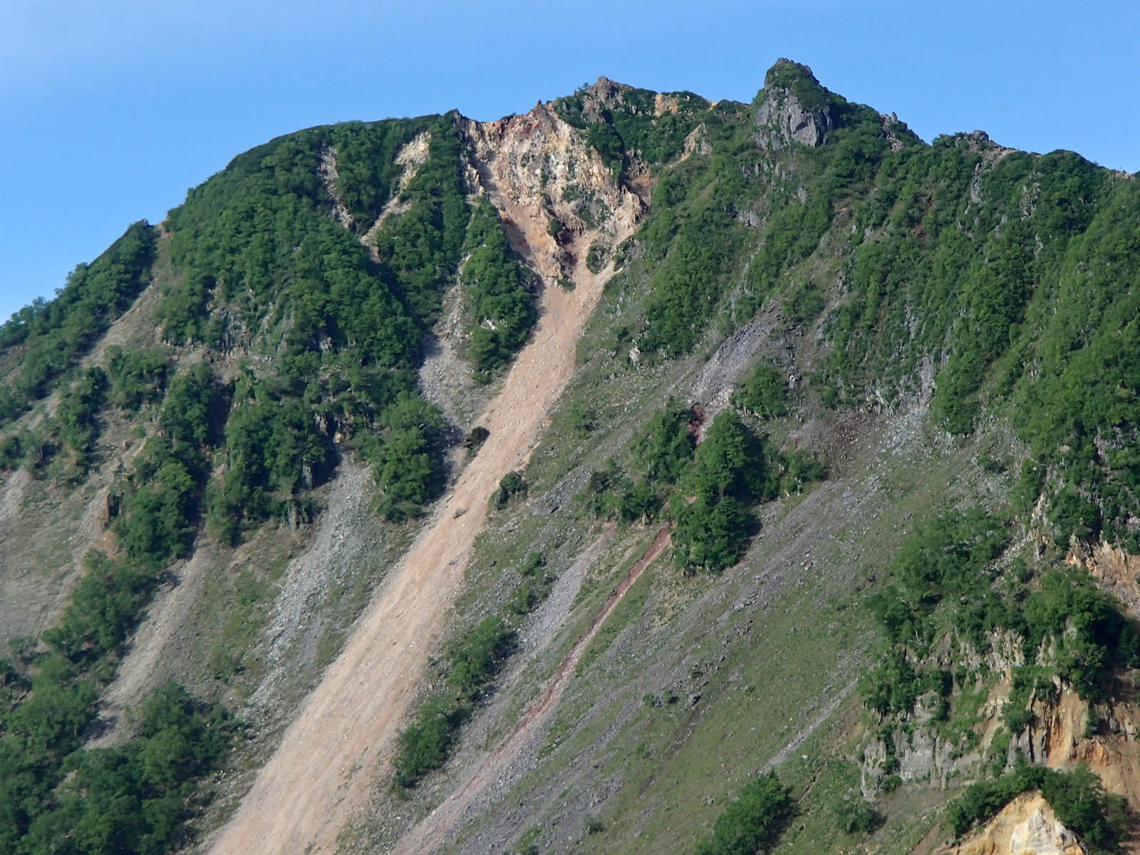 崩落地に出ました。この少し手前で斜面を真っ直ぐ下(進行方向左側)に下っていく踏み跡も見えましたが、ただマーキングは斜面をトラバース気味に進む踏み跡の方にありましたので、こちらに進んで来ました。