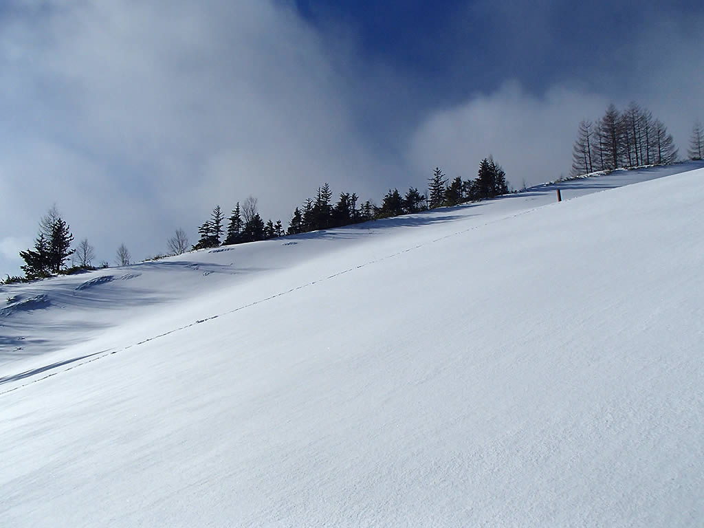 登っていきます。新雪は15cmほどで、その下に堅い層がありました。おそらく雪になる前に降った雨の影響でしょう。