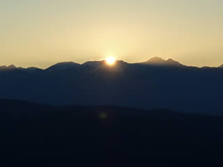 おっ、乗鞍岳に朝日が当たり始めました!。