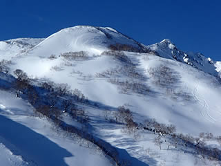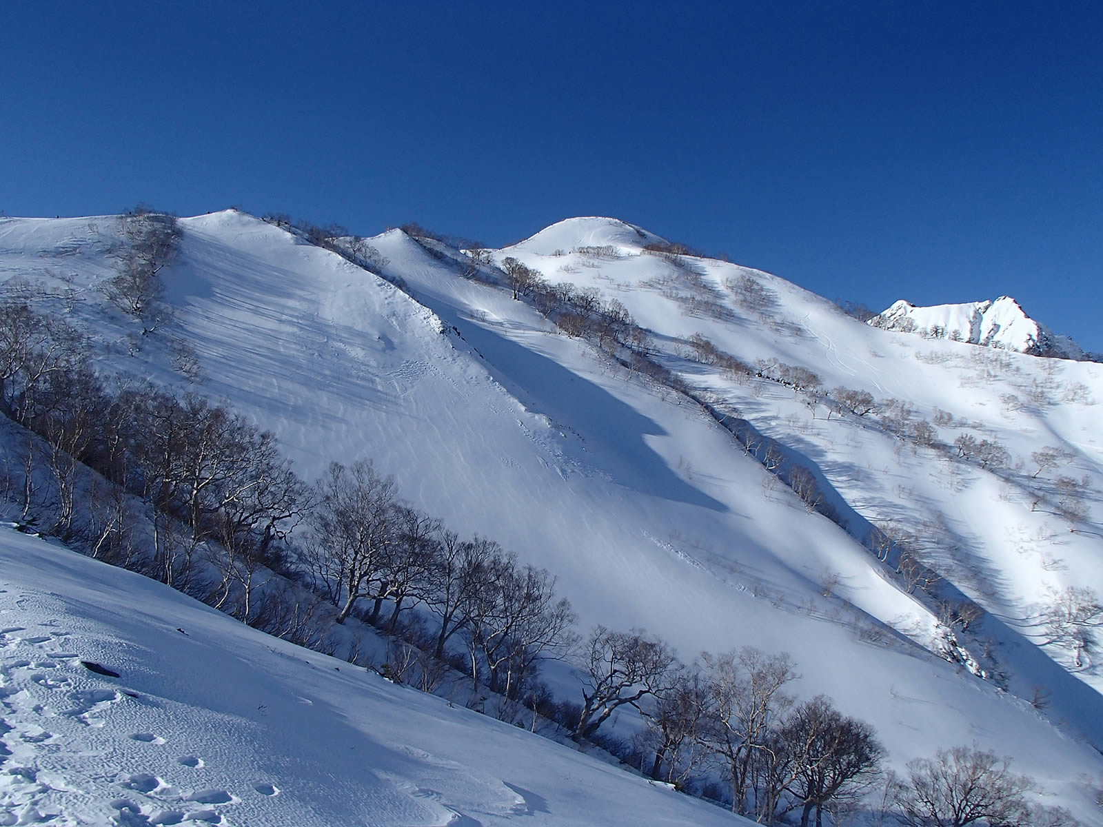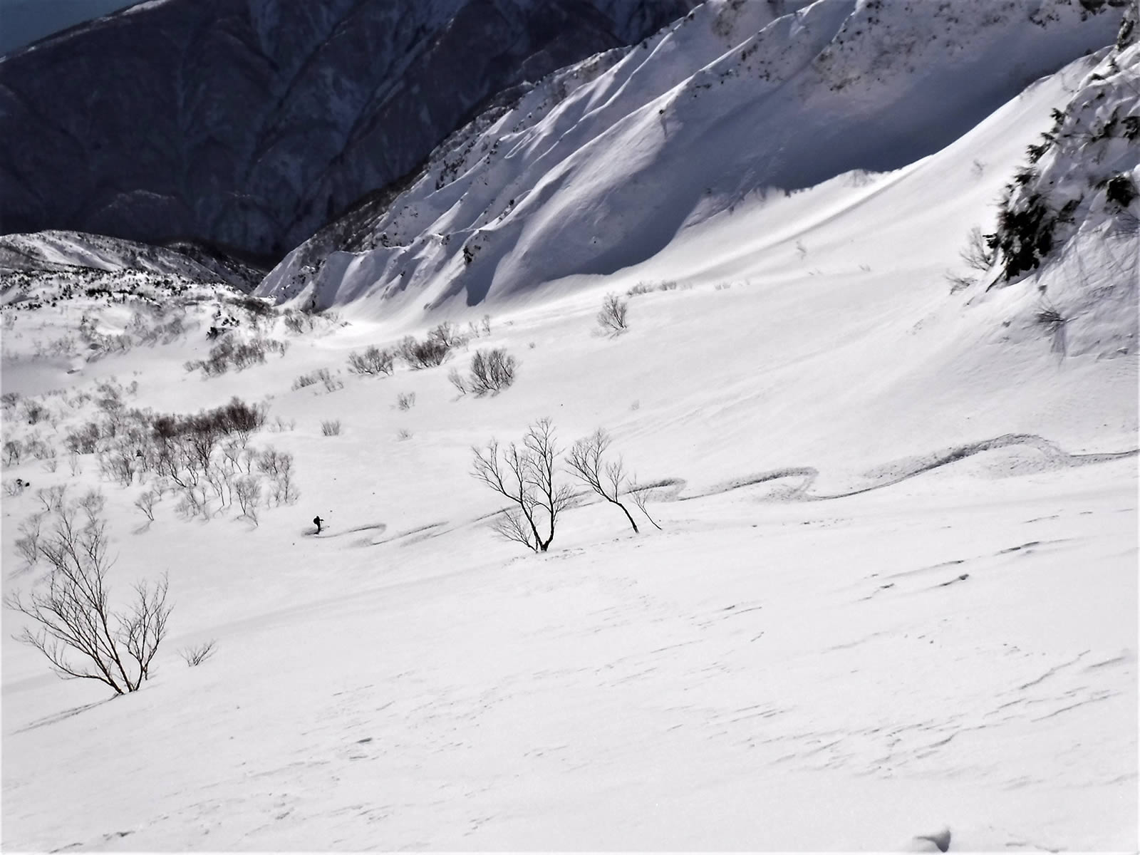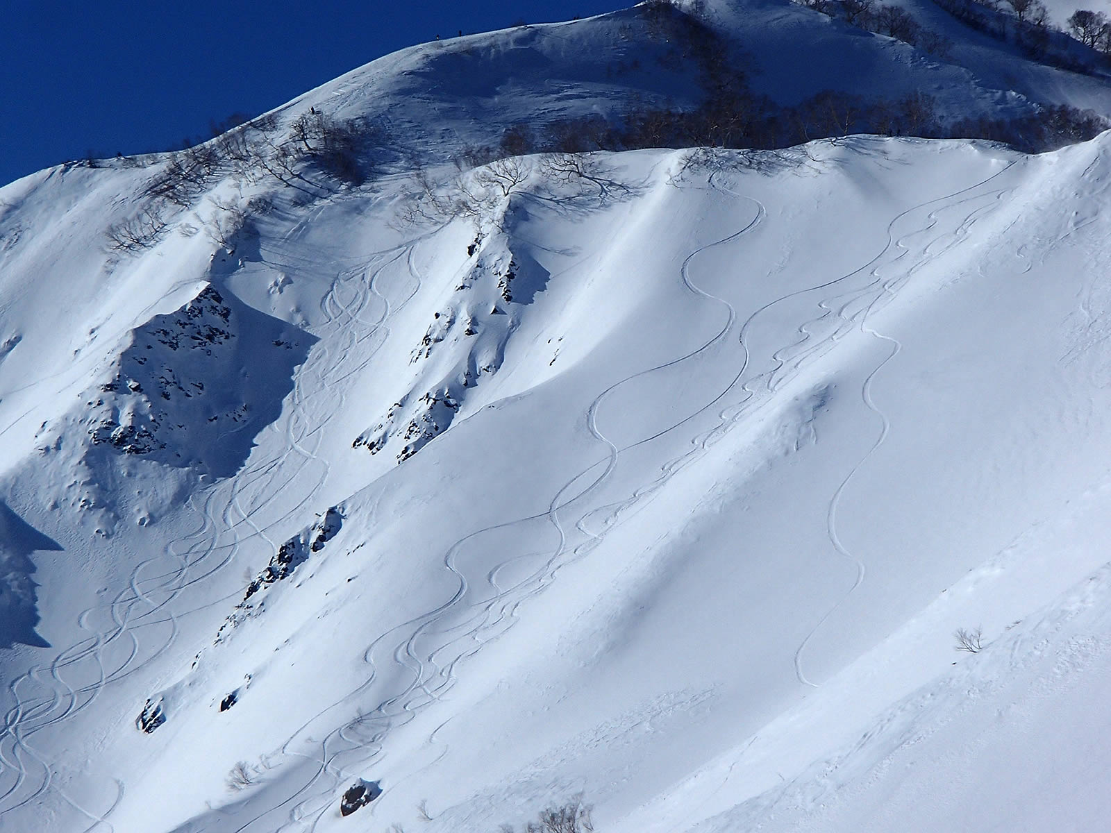 斜面のシュプールがだいぶ増えてきました。私たちが滑った斜面よりさらに左側の急斜面も滑った跡がありますね。すごい!。