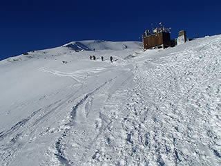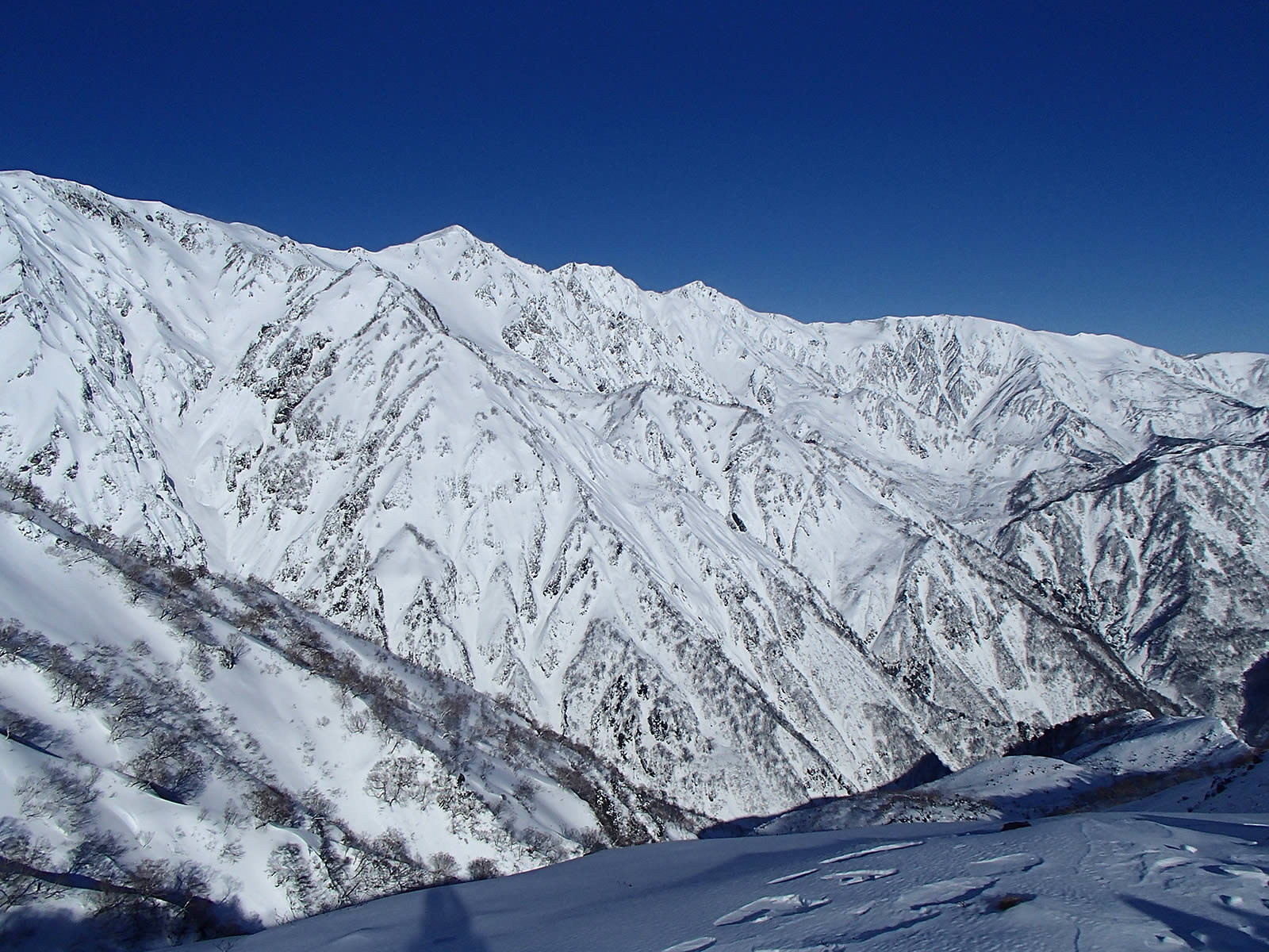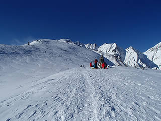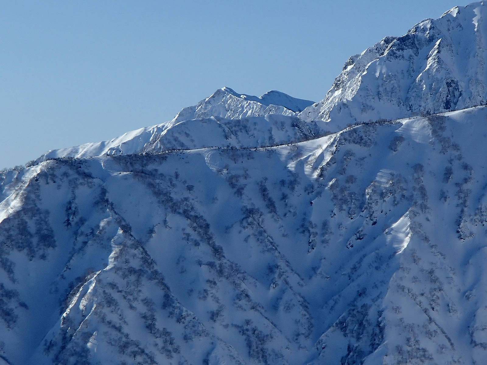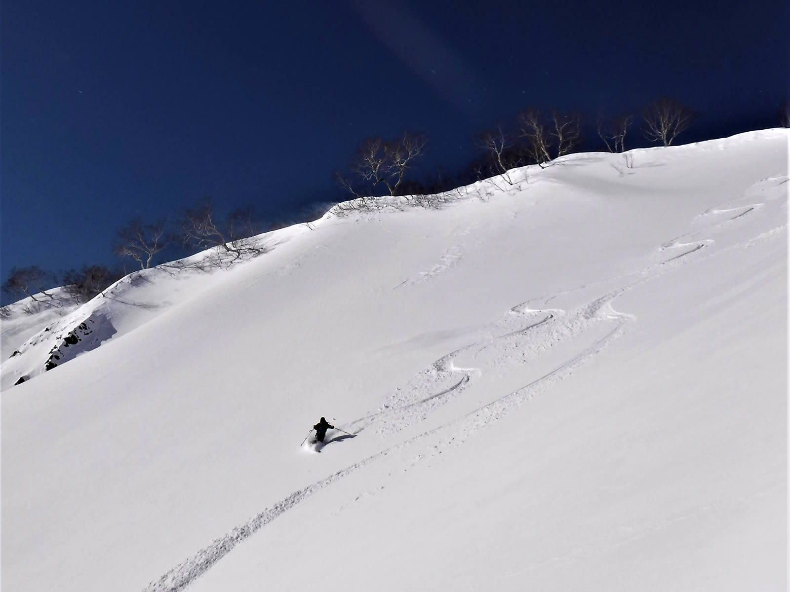 斜面のシュプールがだいぶ増えてきました。私たちが滑った斜面よりさらに左側の急斜面も滑った跡がありますね。すごい!。