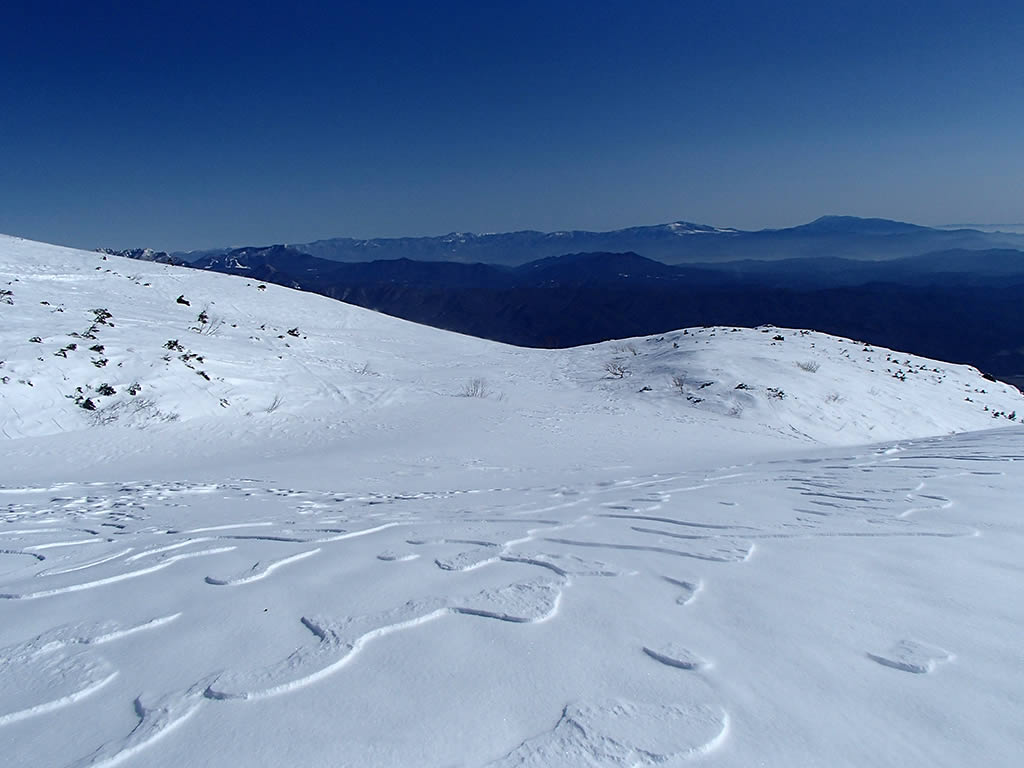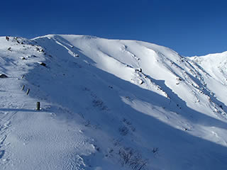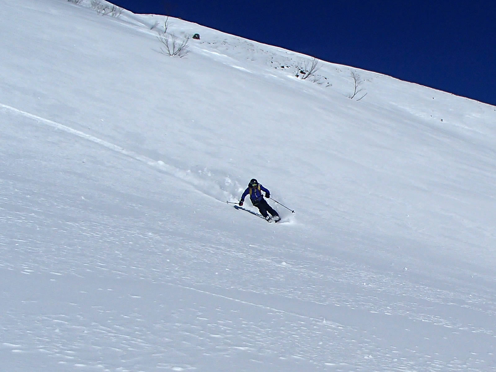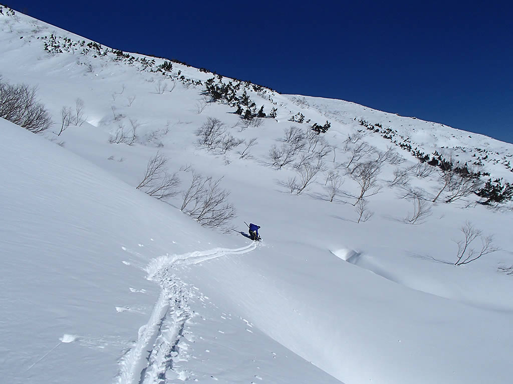 稜線上は雪が飛ばされてカリカリのバーンが出ていました。シールだけではちょっと緊張する部分もありました。本格的BCは実質的に今回が初めてということで足が全く動かず、Bさんに全く追いつけません(^^;。