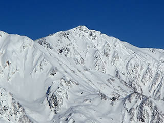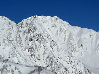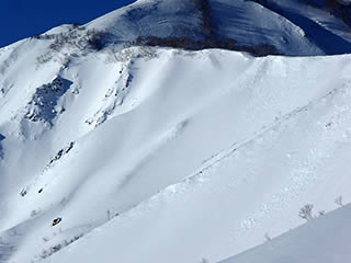 今日滑る予定の八方沢上部。いつも滑る右側の斜面は少し風の影響が見て取れます。ということで今回はその左側の沢を滑ってみることにしました。