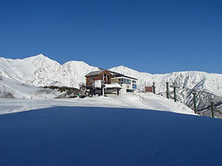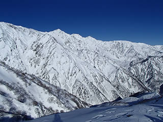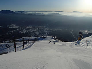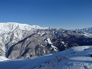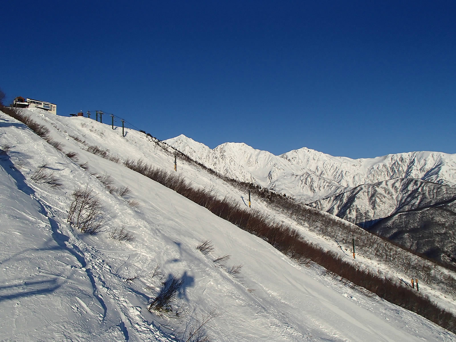 リフトから黒菱ゲレンデと白馬三山を眺めます。