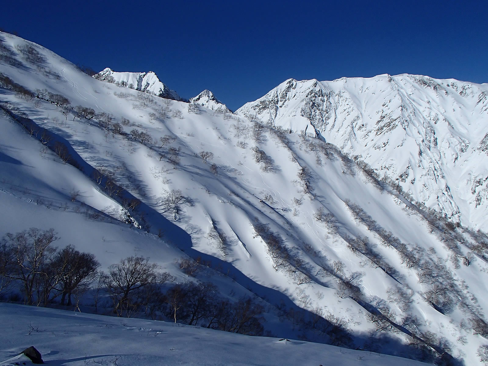 八方沢上部。やはり今回は左側の沢の雪が良さそうです。
