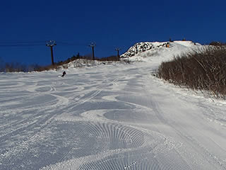 次の写真は帰る途中に眺めた今日滑った斜面の様子。沢山のシュプールもうっすら見えています。