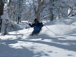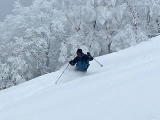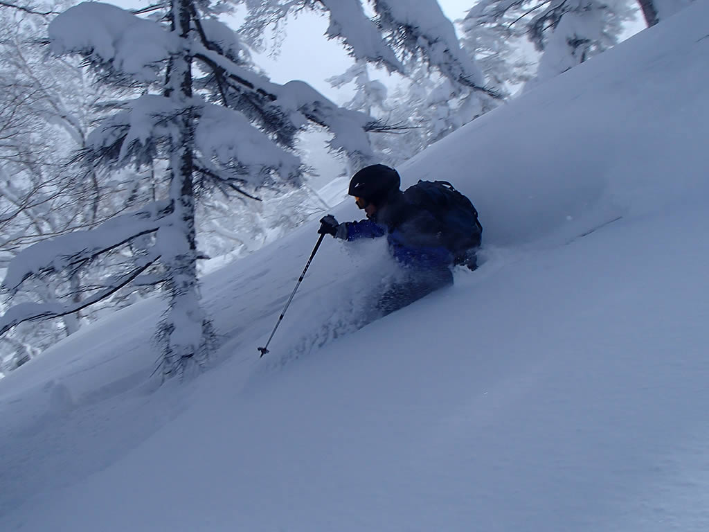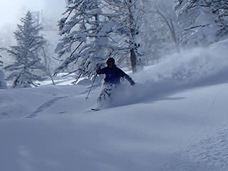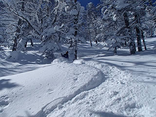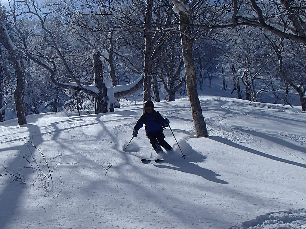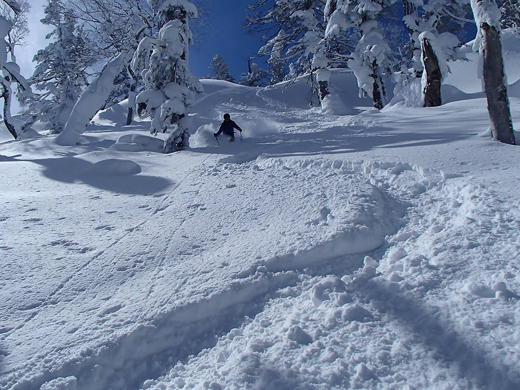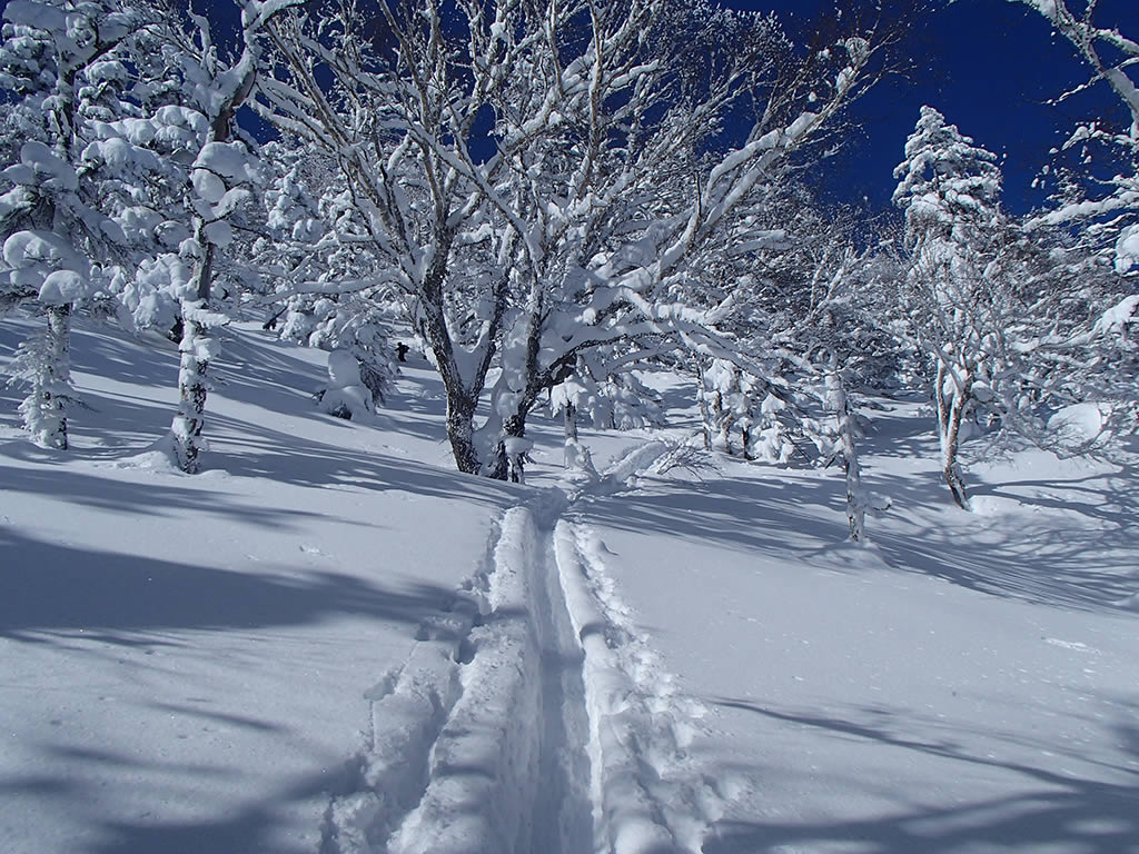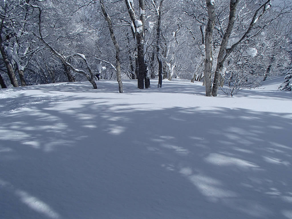 休ゲレンデが近づくと新雪は少し浅くなりました。