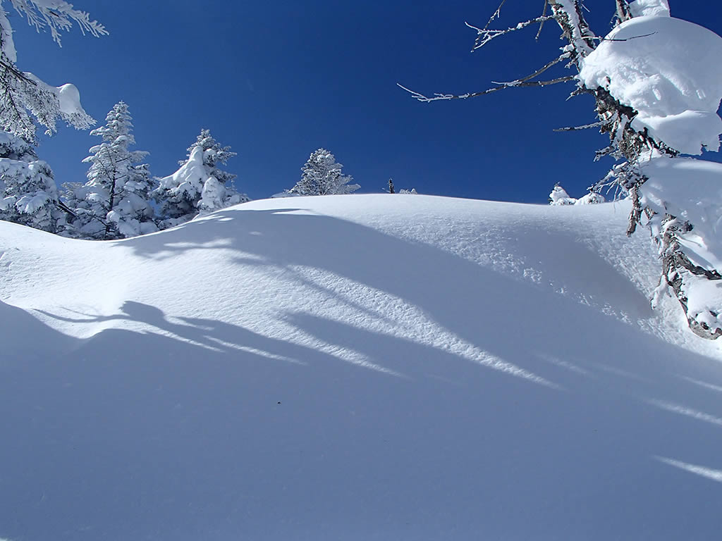 稜線近くは風の影響か少しもっさり気味でしたが、太もも程度のディープパウダーでした(^^)。友人も滑り始めています。