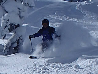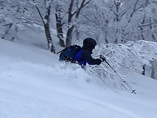 少し下ると雪は一気に深くかつさらさらになりました(^^)。次の3枚の写真は私ですが、腰パウダーです(^^)。
