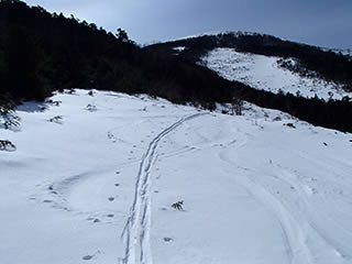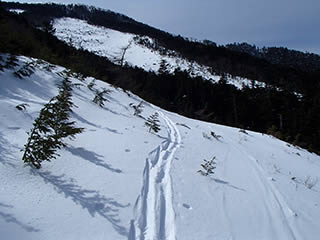 スキーで登ったトレースがありましたので、ありがたく使わせていただきました。