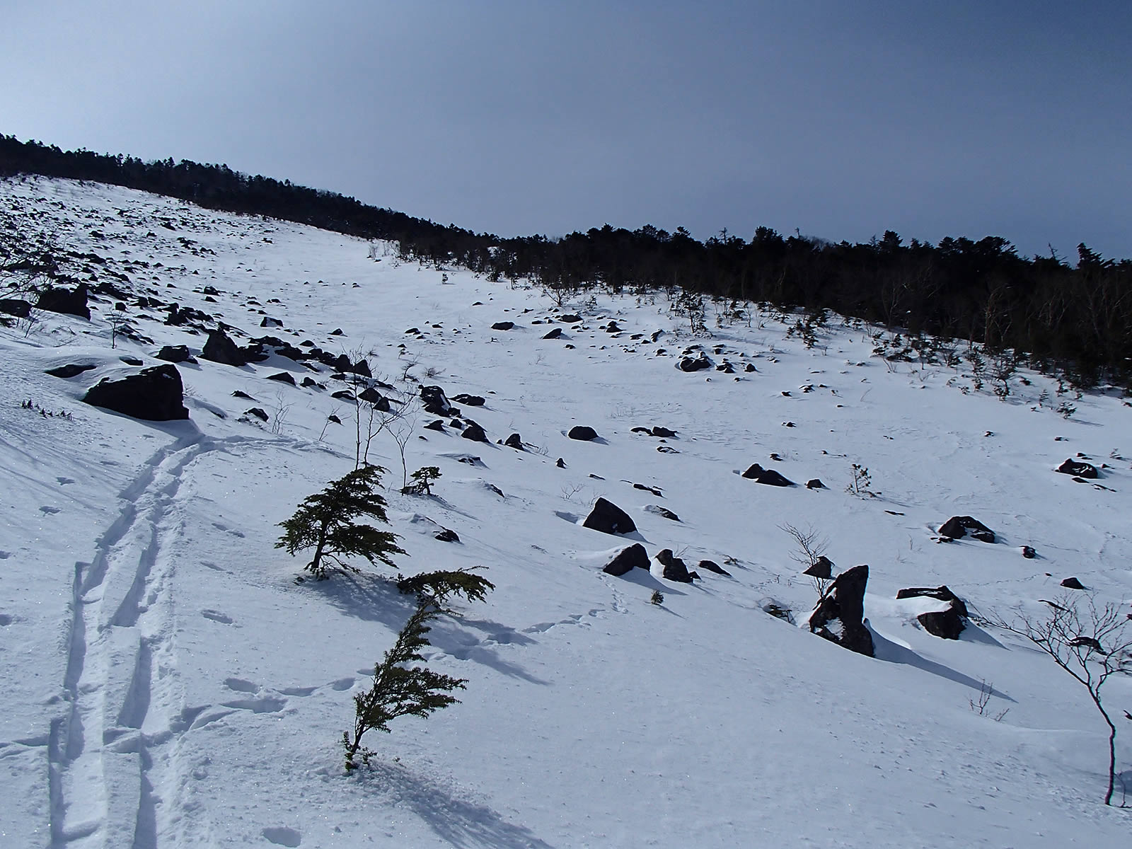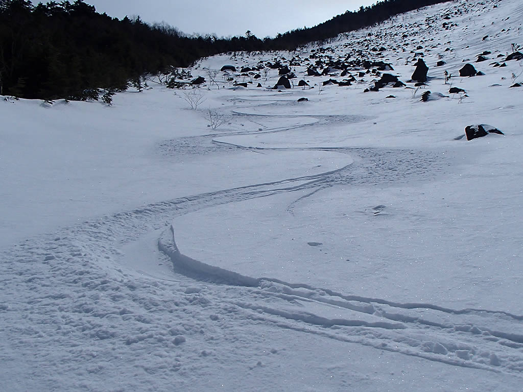 この先は登山道周辺を適当に滑り降りていきますが、雪の状態がそれなりなので修行の滑りです。