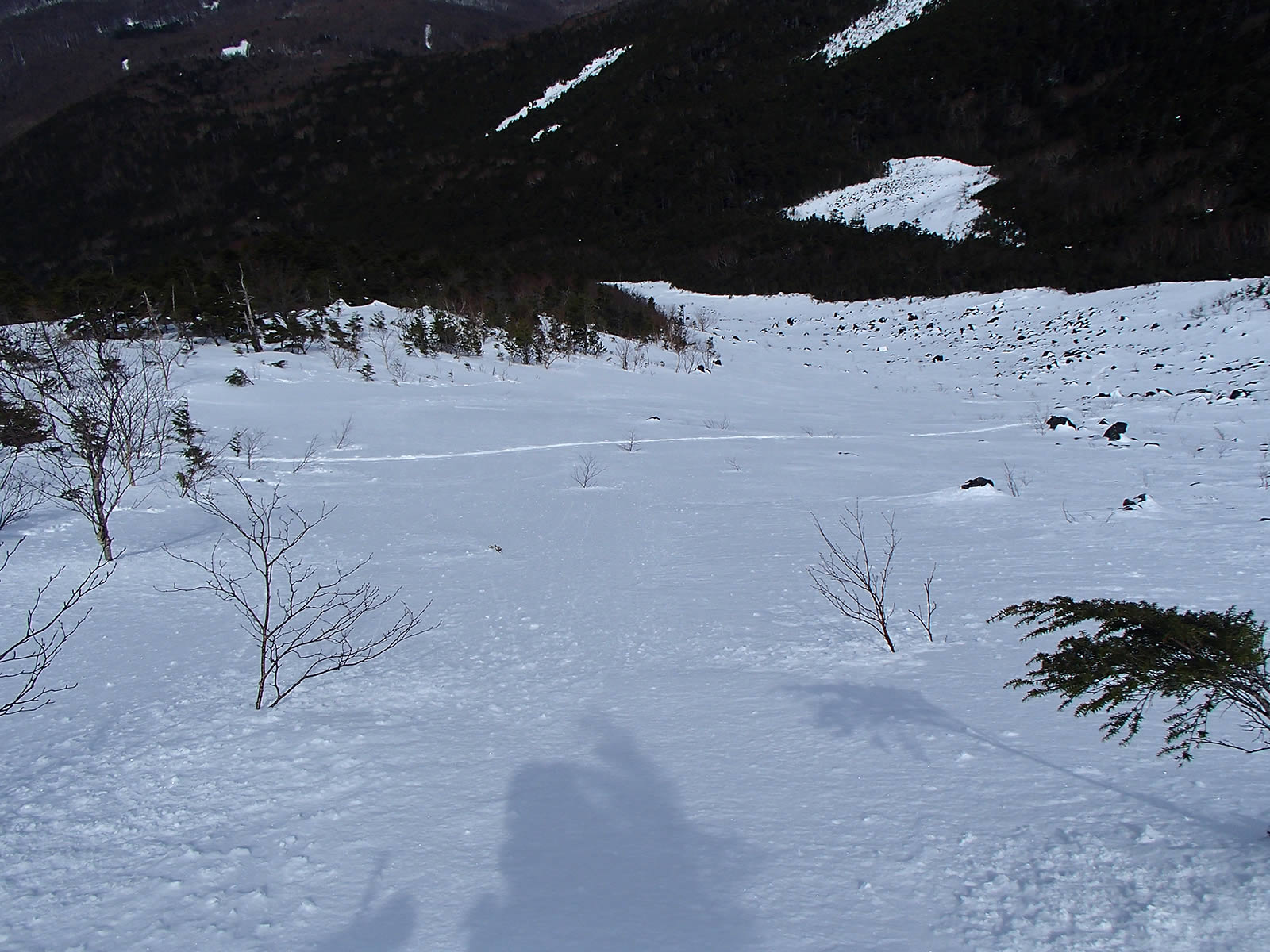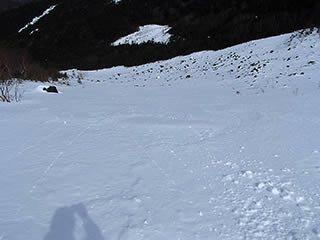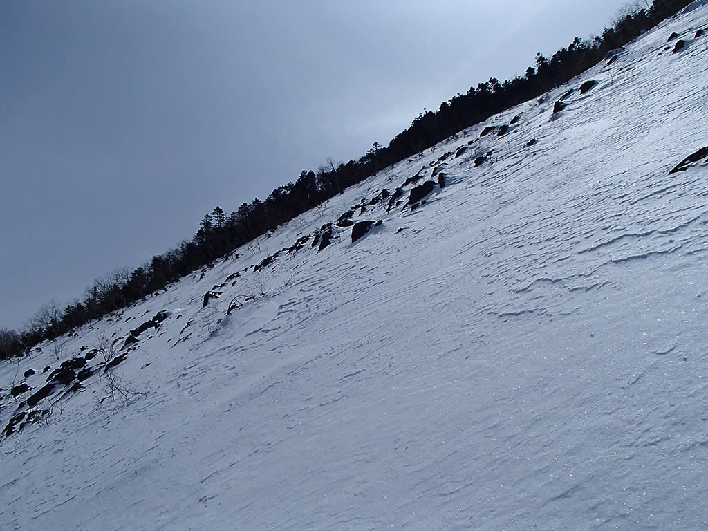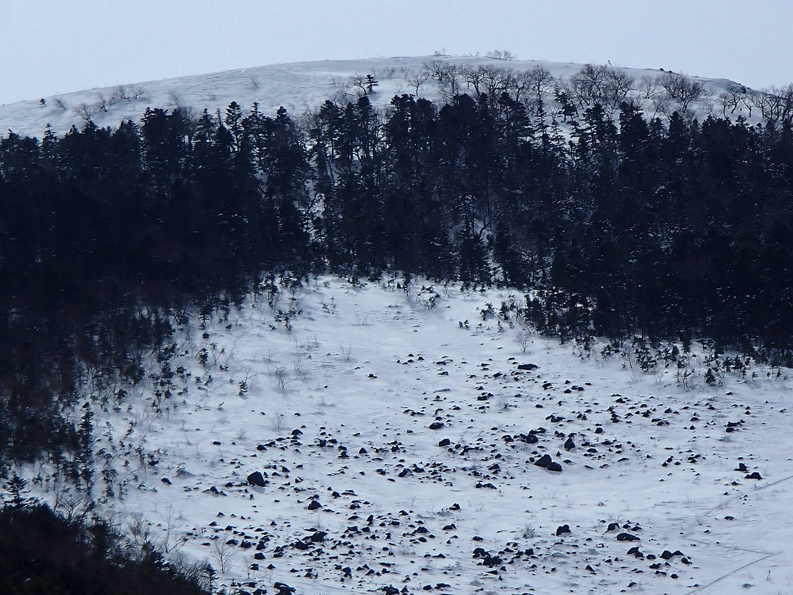 斜面上部をズーム。もう少し雪が増えたらぜひ一番上の稜線から滑り降りたいです。