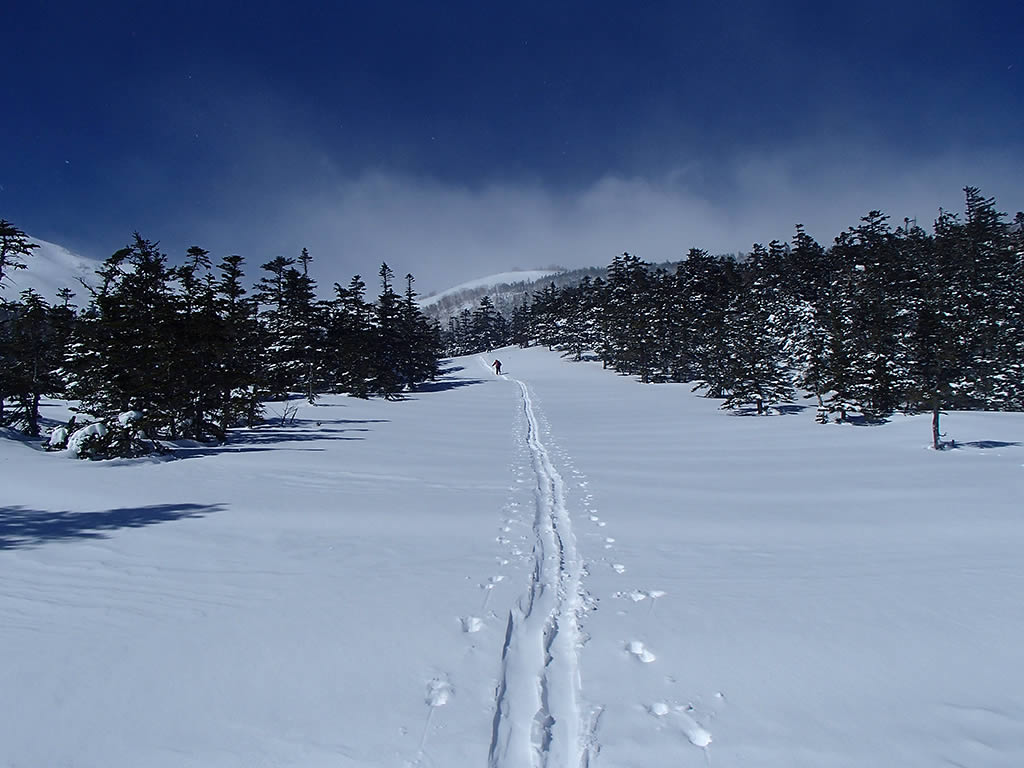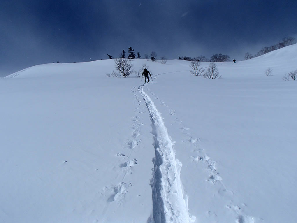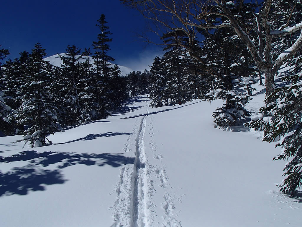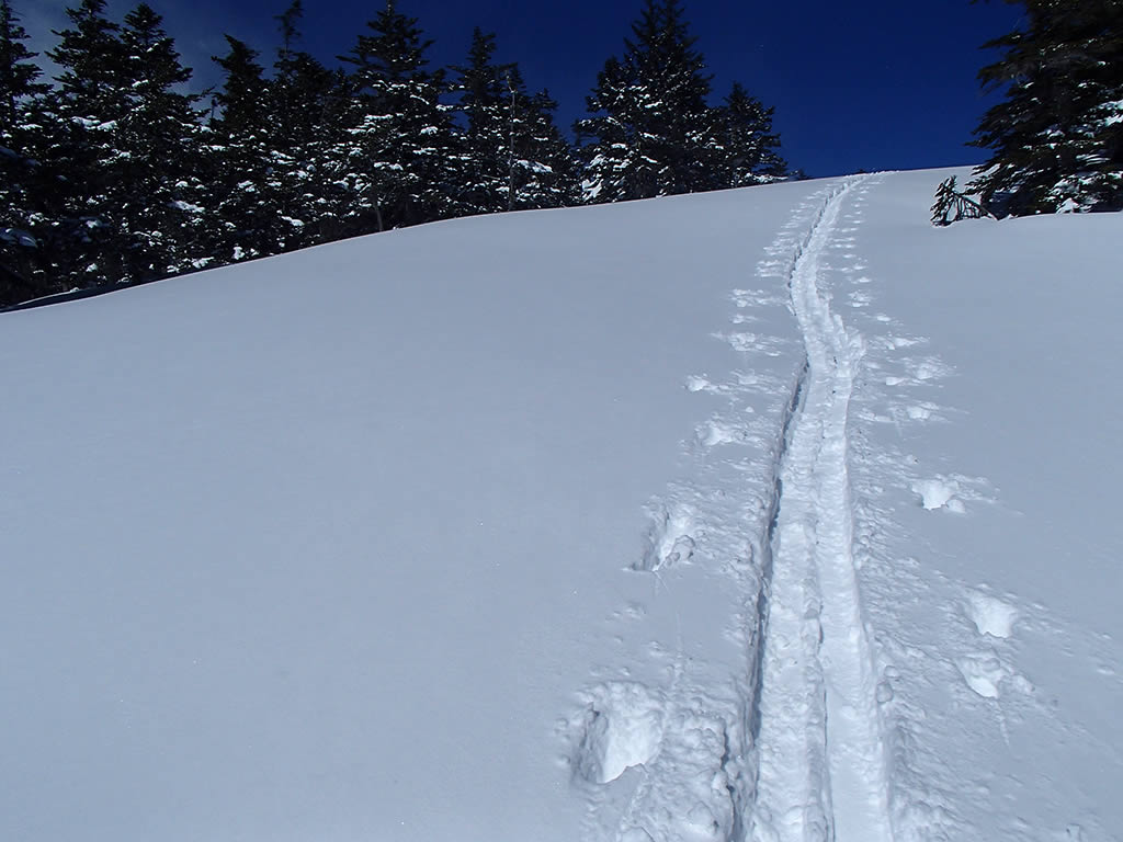 この辺りの新雪は10〜15cmほど。ただし下地が堅いのでシールが滑りやすいです。