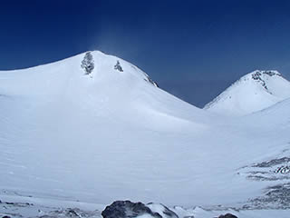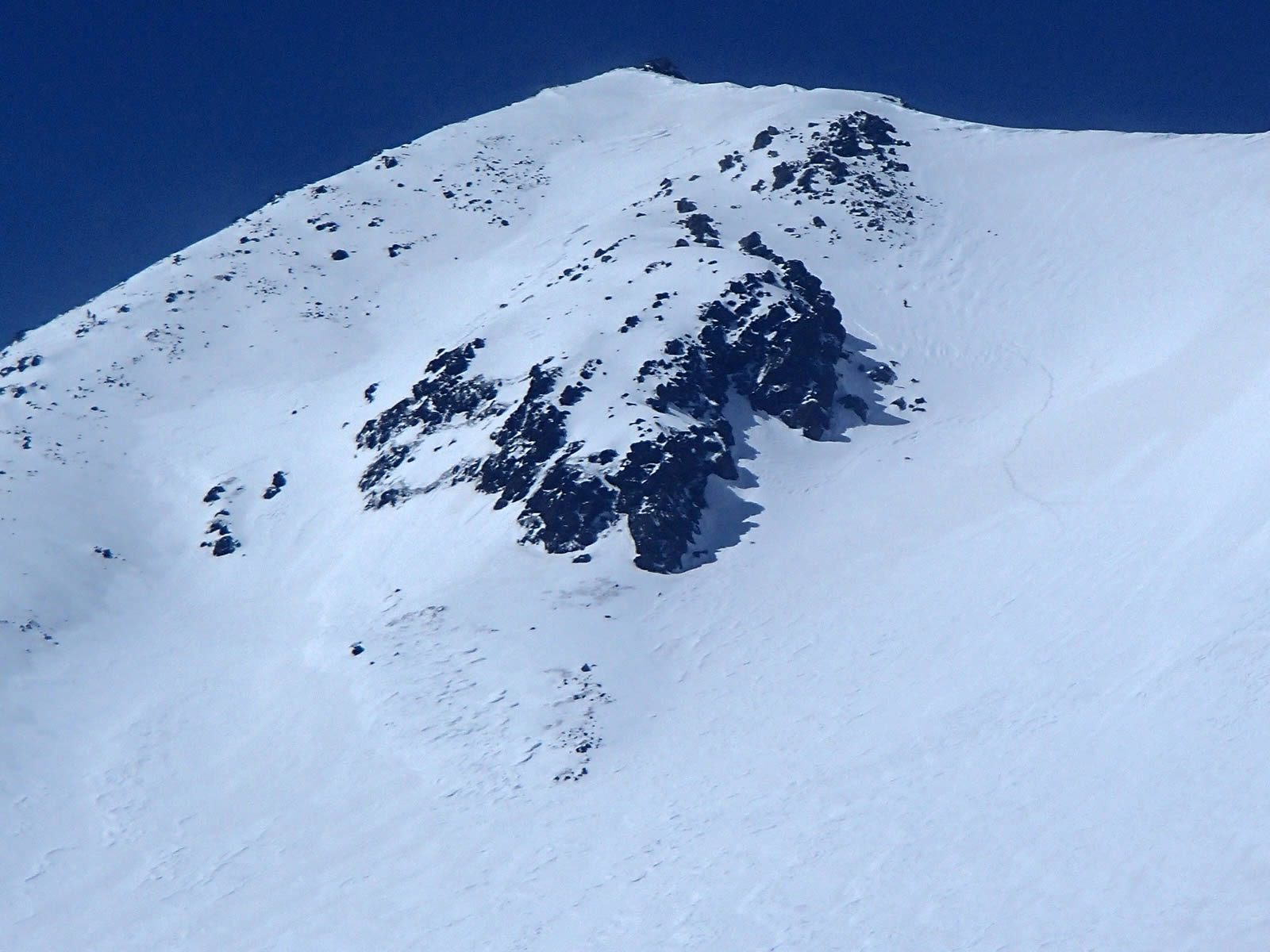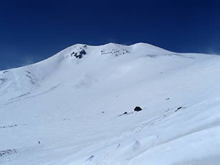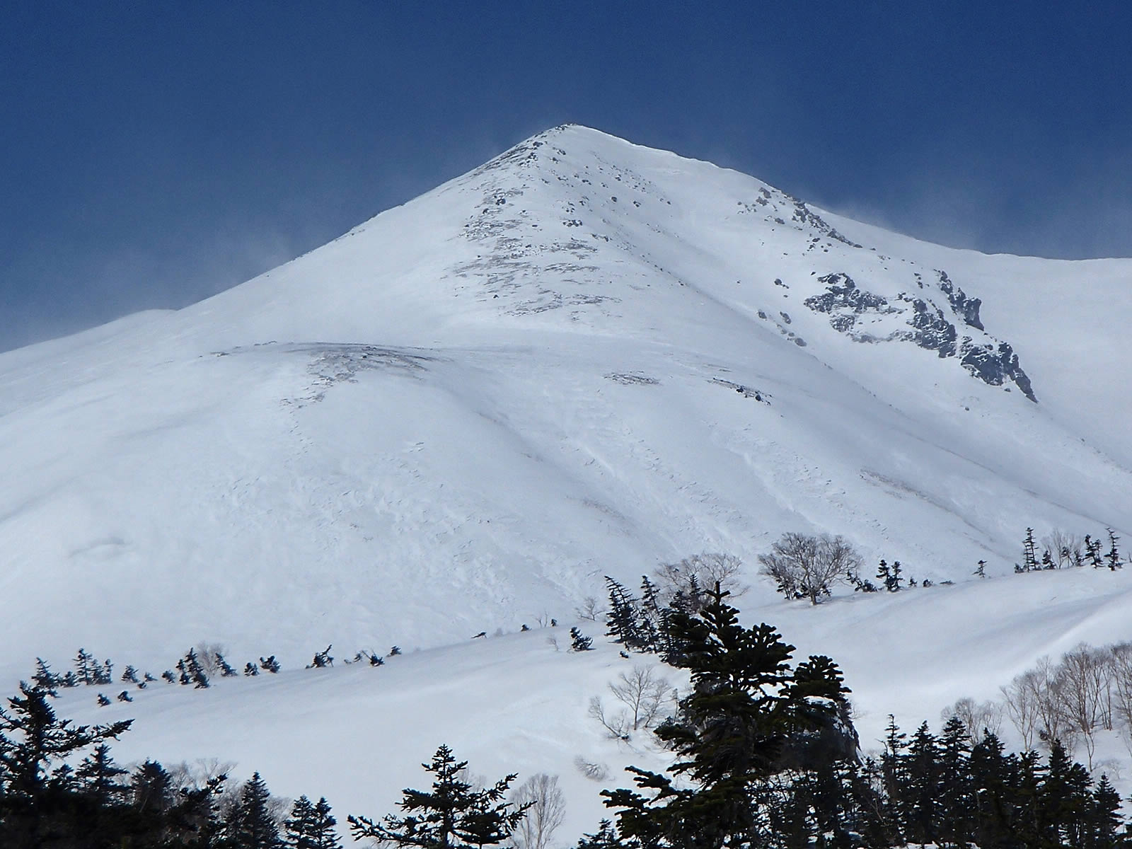 剣ヶ峰をズーム。うーん、新雪が吹き溜まっている訳では無い様な...。しかもこの強風ということで、進路をあっさり富士見沢に変更しました。
