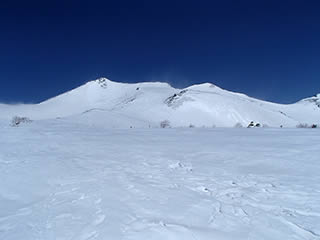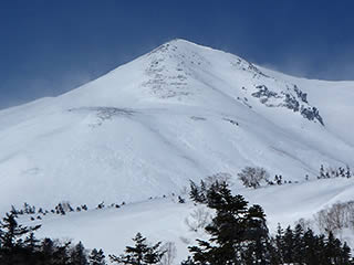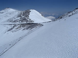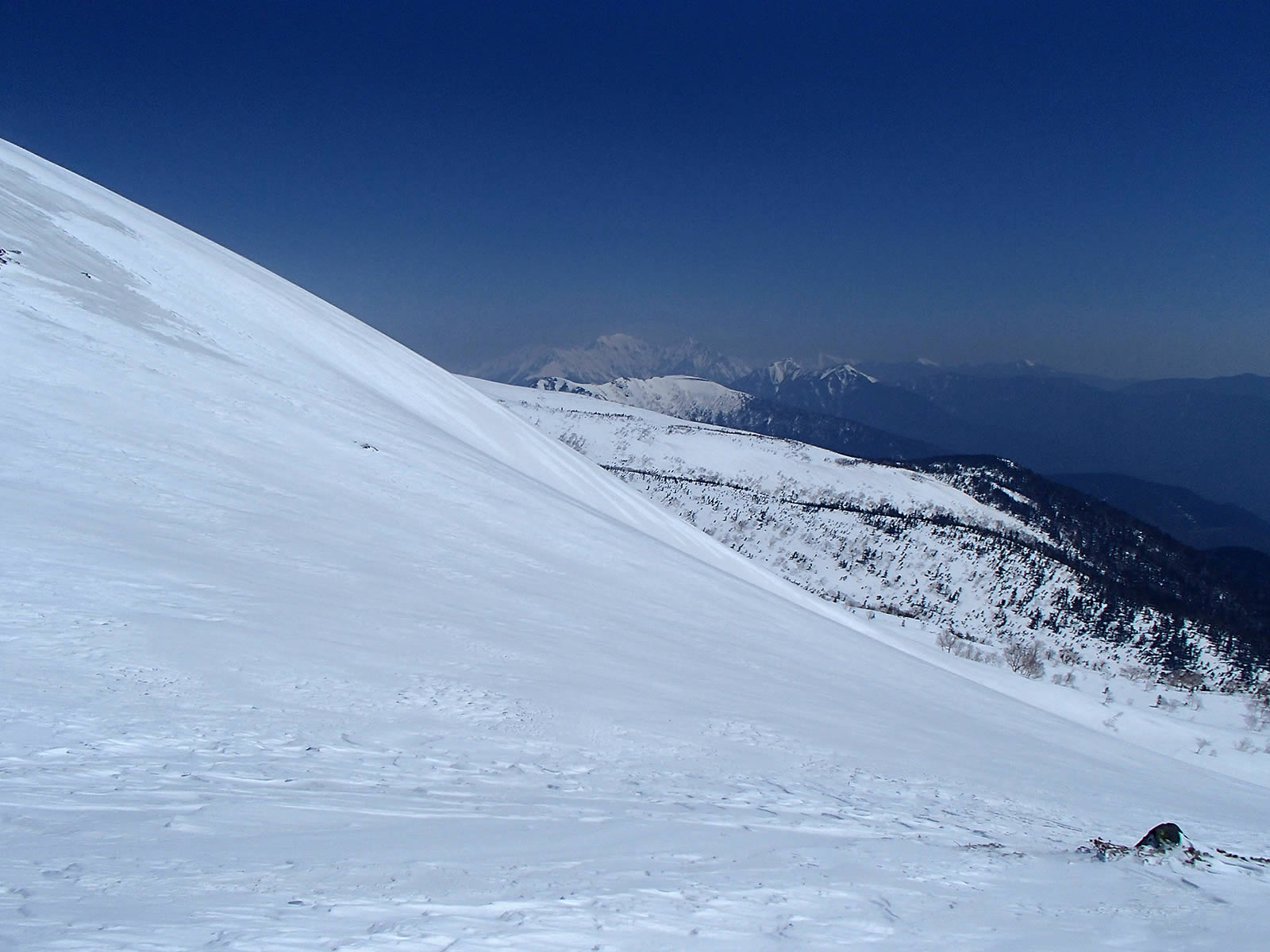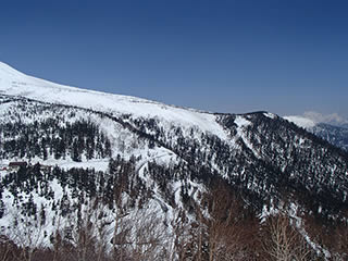 剣ヶ峰と蚕玉岳の間の斜面にシュプールが見えました。でも斜面は少し堅めかな。