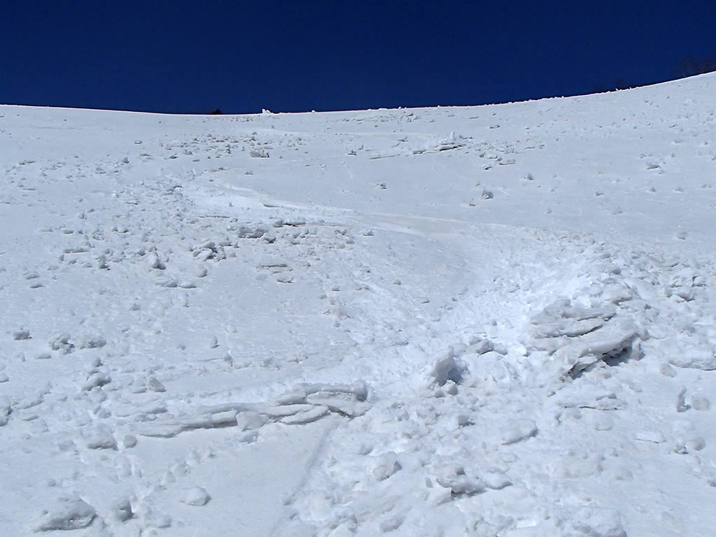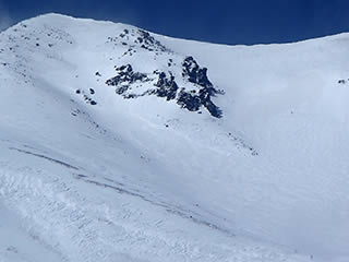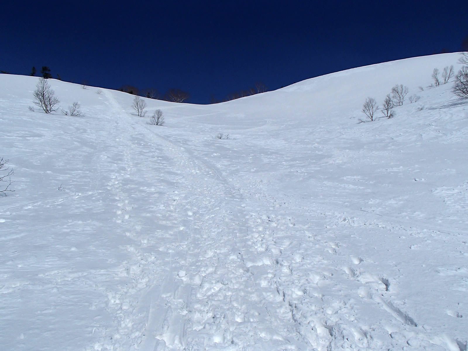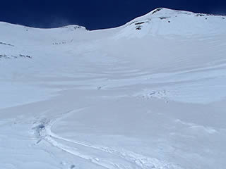 富士見岳山頂側(下に向かって左側)ほど斜面上部が急で雪崩れやすいので、あまりそちらには行かずにこの辺りから。
