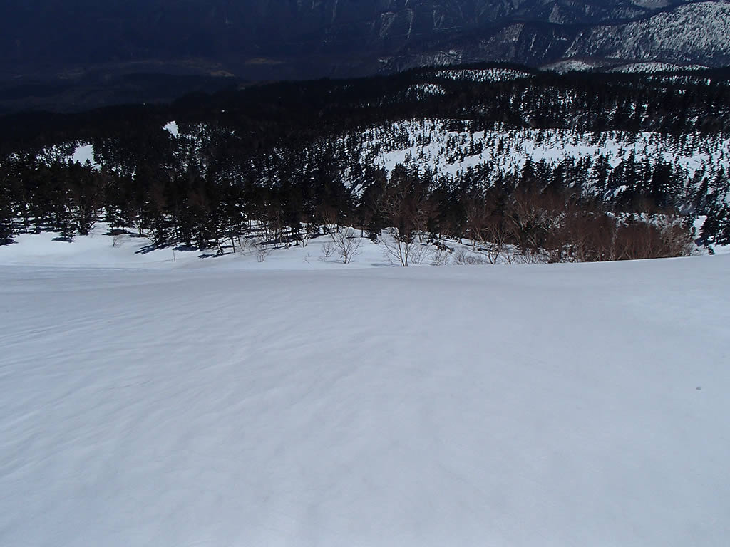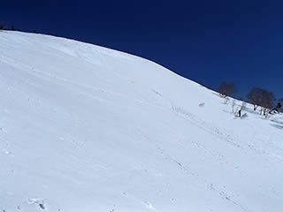 斜面上部には30cmほどの新雪が吹き溜まっていました。ただし湿雪のパックスノー気味で滑りにくく、慎重にターンして滑ります。