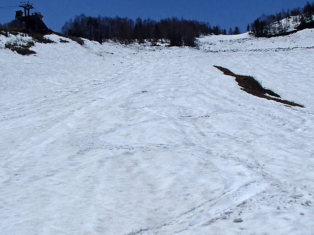 一気にゲレンデまで戻ってきました。ゲレンデの雪は意外にも緩んでいるのは表面だけで、今日一番の滑りやすい雪だったかも(^^;。