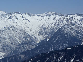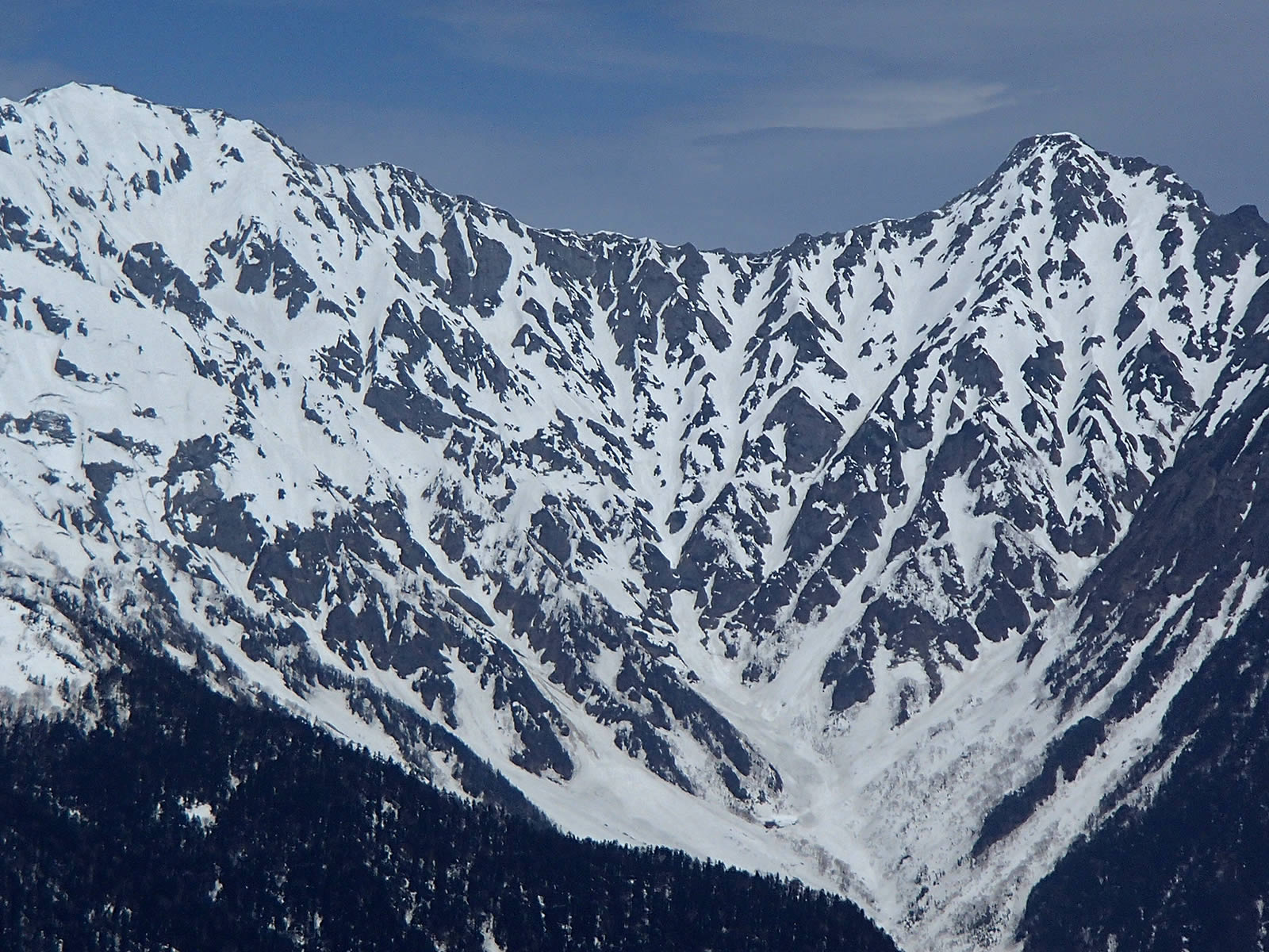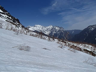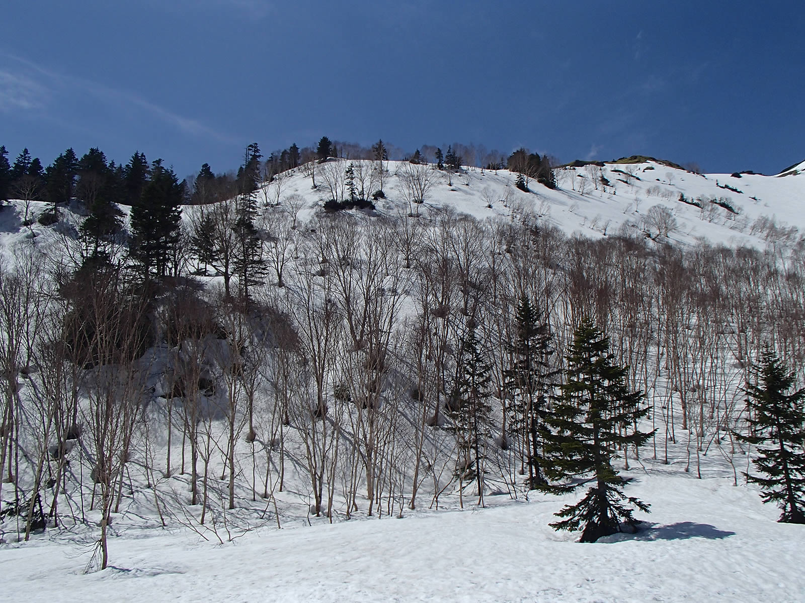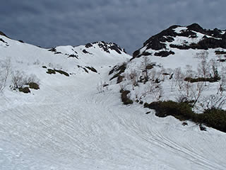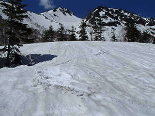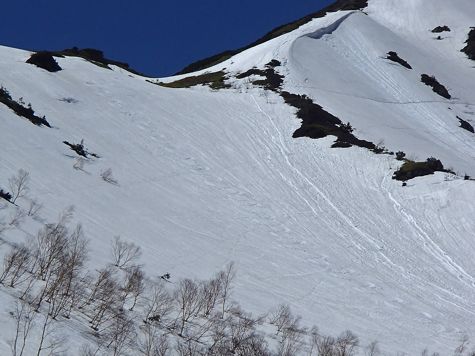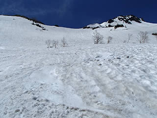 雪崩れた跡がいくつもあります。雪が緩む時間帯は要注意です。