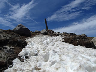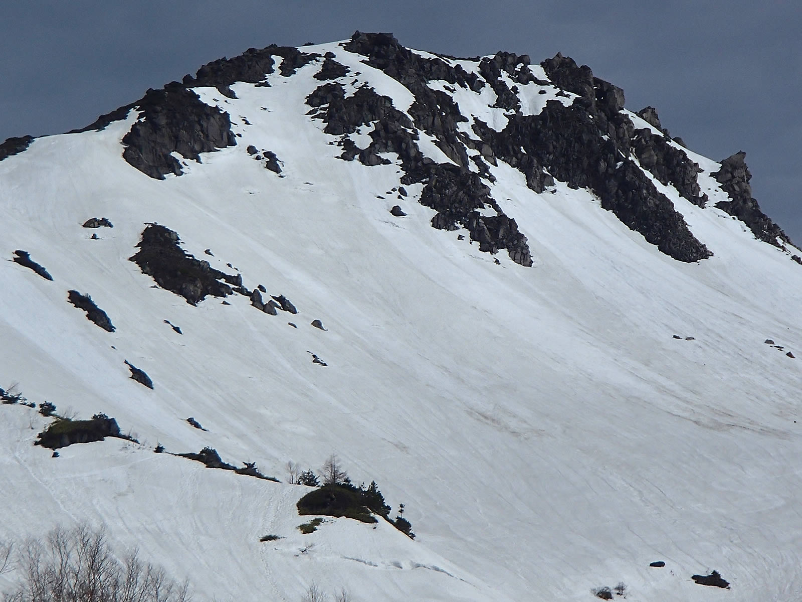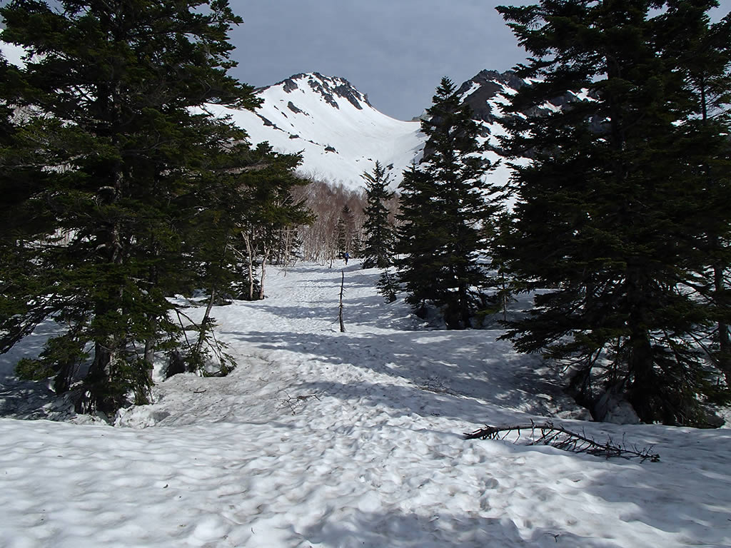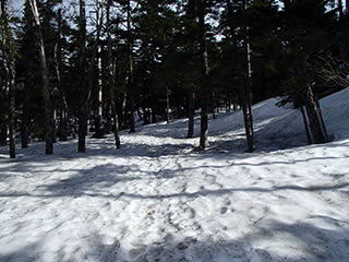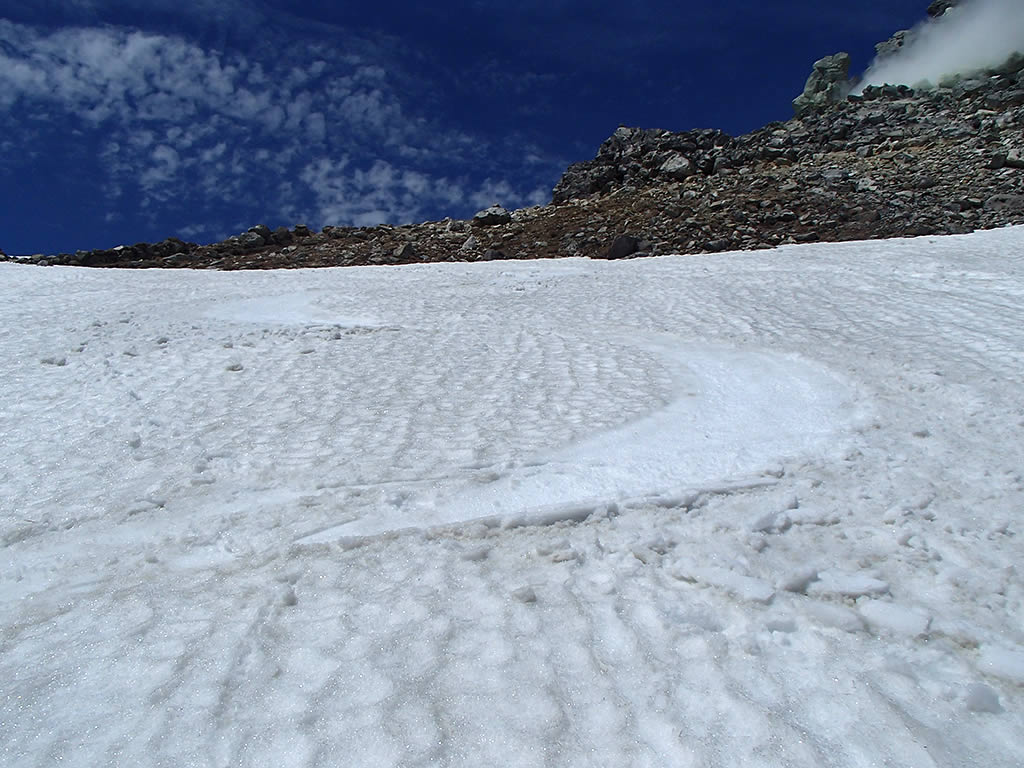 まもなく斜面一面が残雪で覆われます。朝はかちかち。アイゼンは必須です。