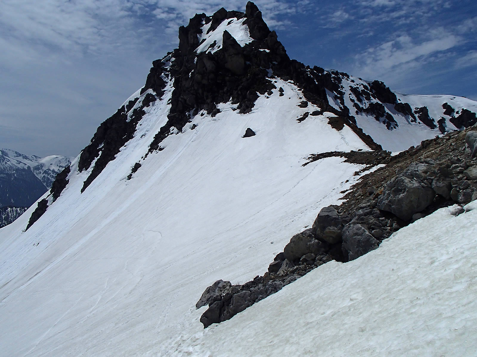 登り返し地点までスキーで滑り降り、その先はスキーはザックに付け、アイゼンで下りました。