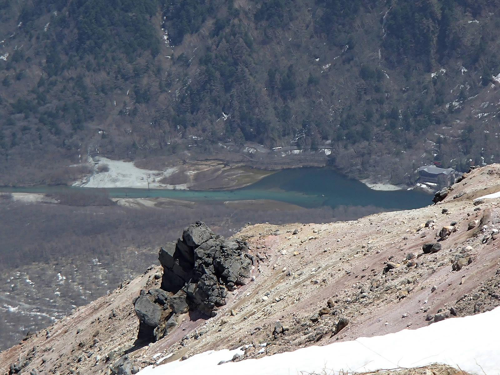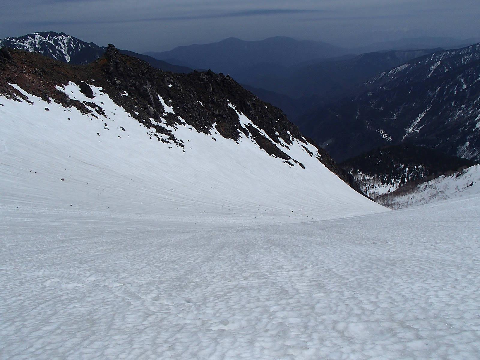 最後の急斜面は一部ぬかるんでいましたが、雪が完全に消えている訳では無いので、そのままアイゼンで下っていきます。