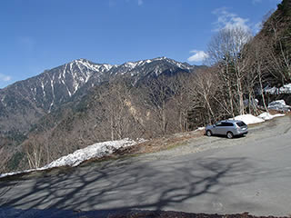 自宅を4時15分に出発し、新中の湯登山口の駐車場に向かいます。そして5時52分、登山口近くの駐車場に到着。私より先には1台しか駐まっておらず、おそらくこの日は多くても10台ほどだったのではと予想します。駐車スペースの向こうに穂高が見えています。