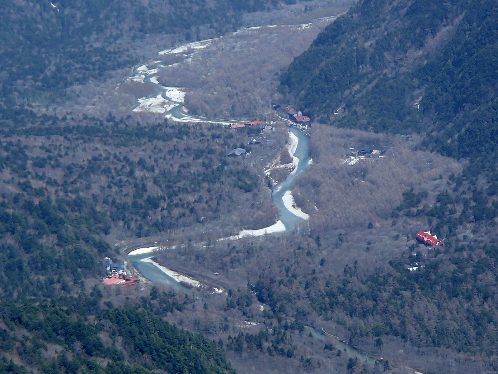 上高地。きっと多くの人が河童橋の上からこちらを眺めていることでしょう。