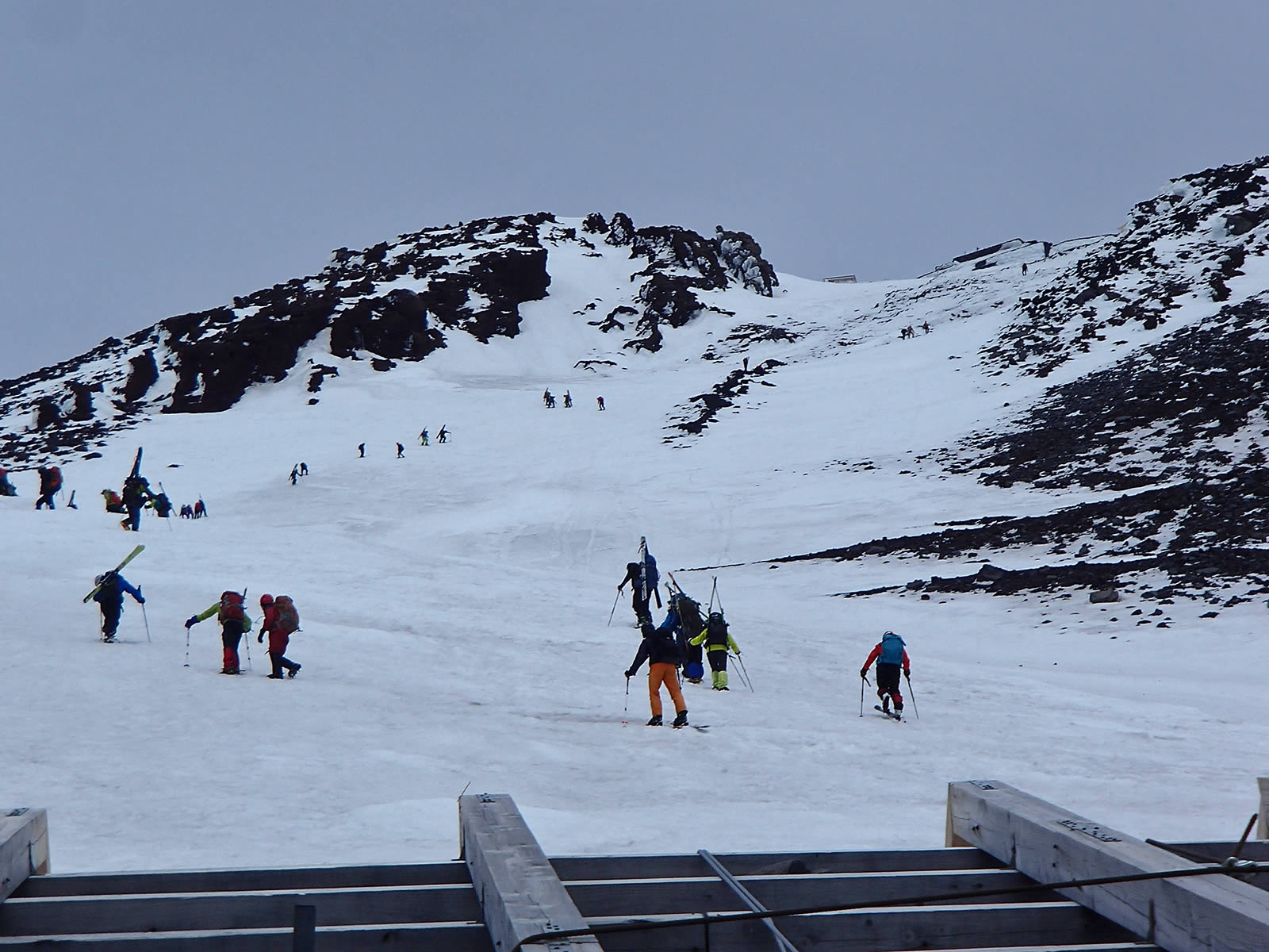 9時46分、八合目に到着。大休止とします。ここでアプローチシューズからスキーのブーツ+アイゼンに履き替えました。