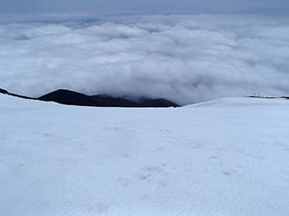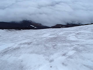 登山道を離れ雪渓上を直登します。が、徐々に風も強くなり(多分風速10m/秒ほど)、空気の薄さもあってかペースが徐々に落ちていきました(^^;。