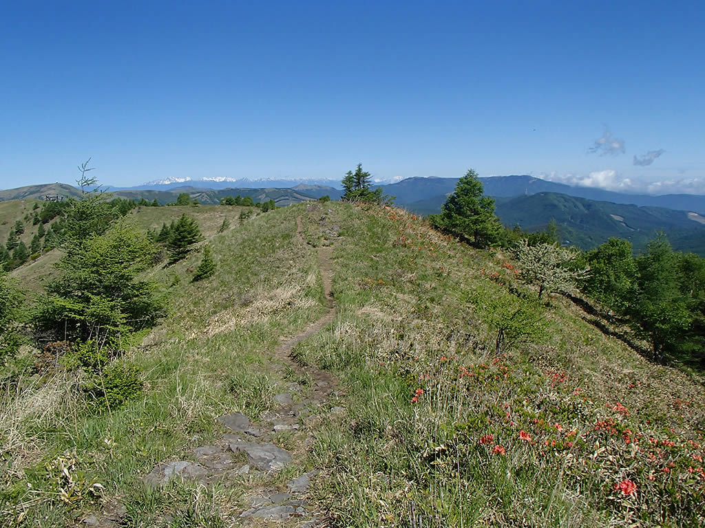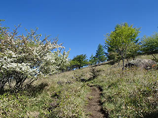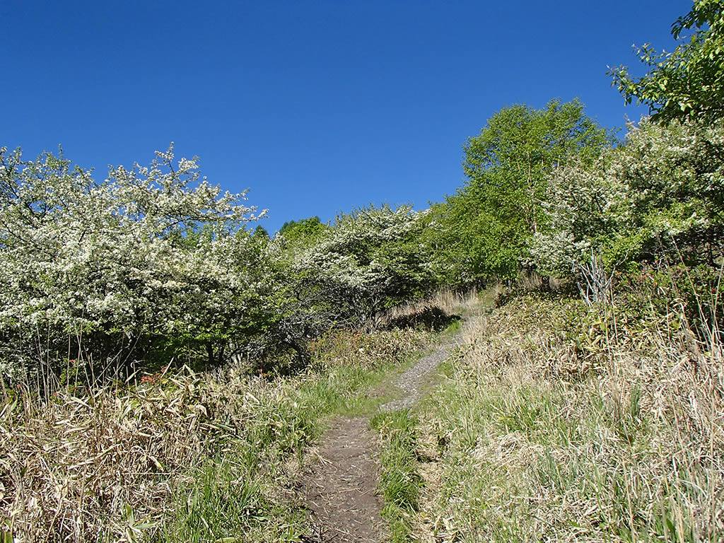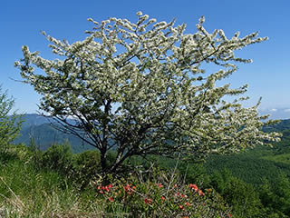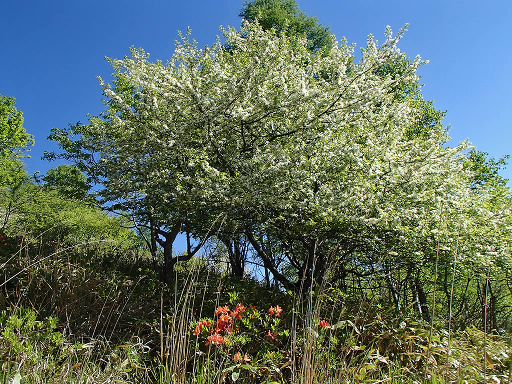 レンゲツツジですが、登山口からヒュッテアルビレオ間は咲き始め、ヒュッテアルビレオから中間ピークまではほぼつぼみでしたが、中間ピークから先の斜面では5分咲き位には咲いていました。ズミは満開です。