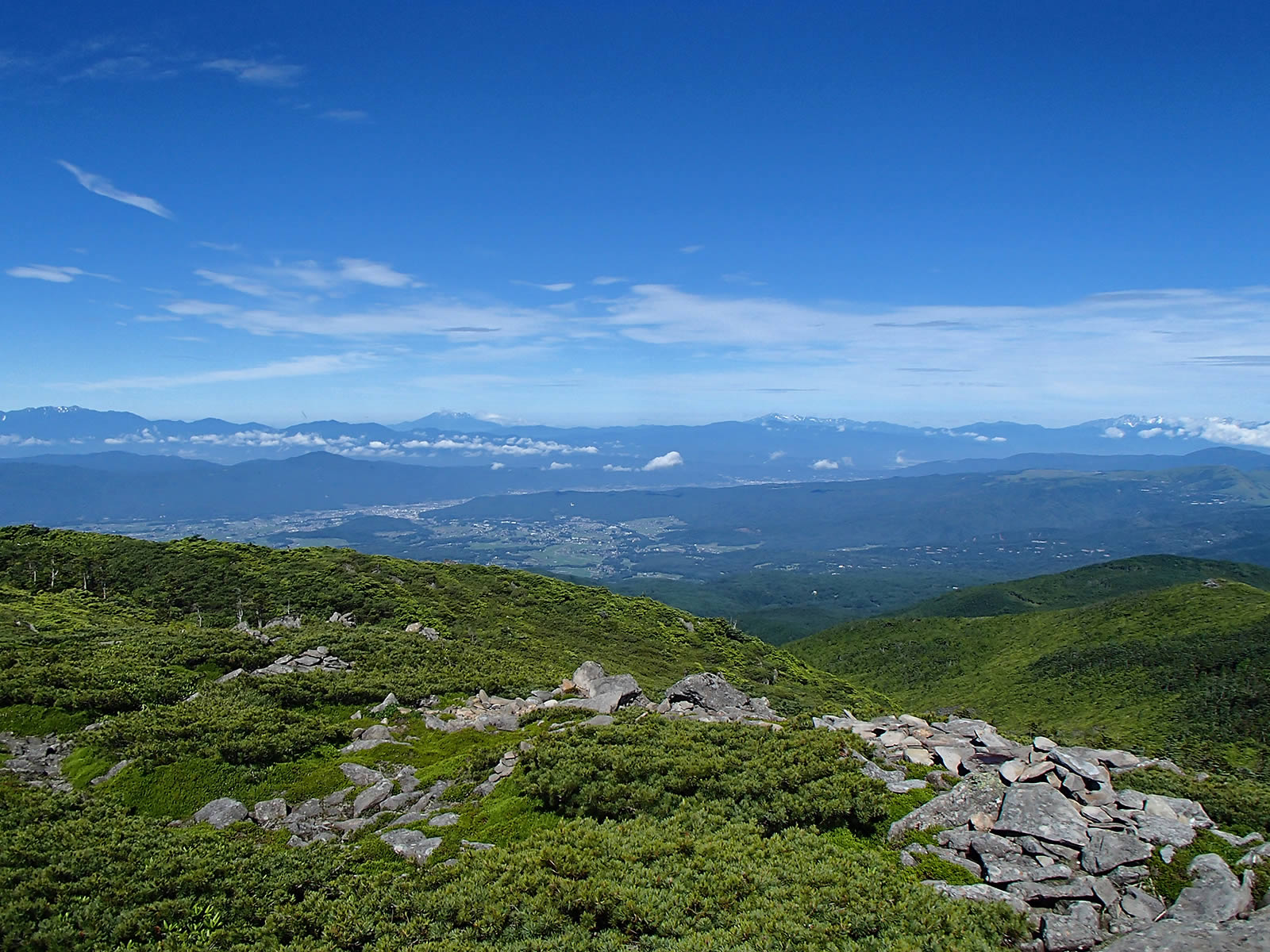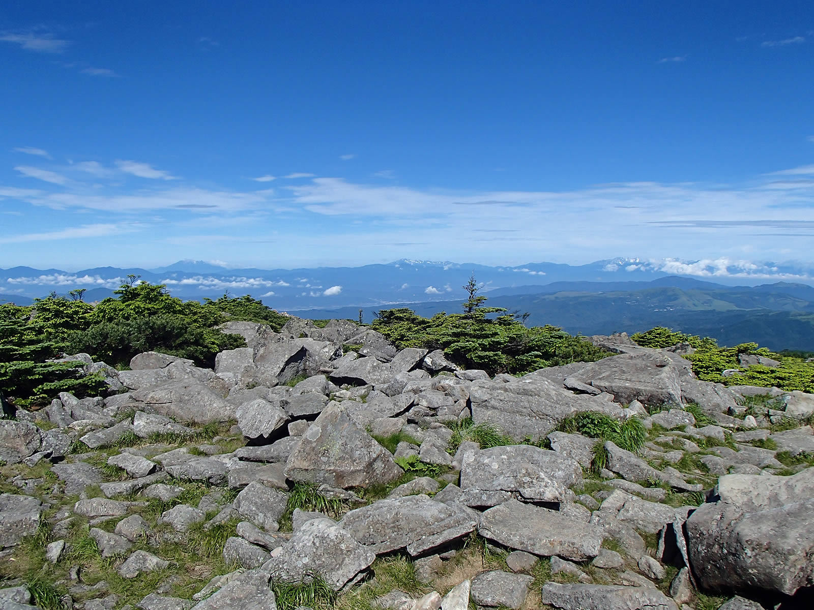 槍穂高。手前にニッコウキスゲが見頃の車山、霧ヶ峰。
