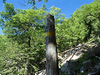 中山峠方向に少し進むと、短い階段の手前に稲子岳へのバリエーションルートの入口があります。このクロスした木が目印。