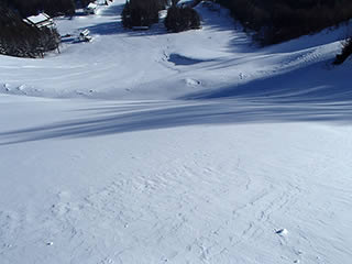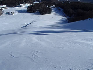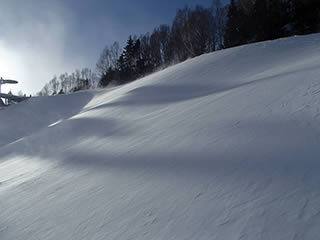 この斜面はなかなかディープで楽しめました。吹き溜まりは30cmほど。