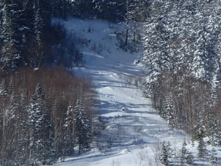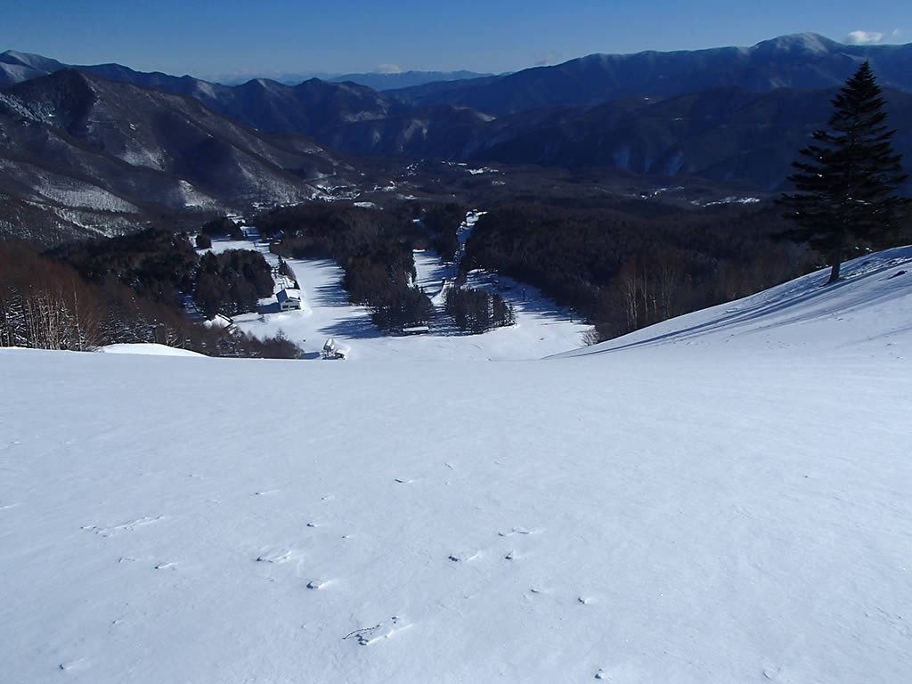 再び登り返してリフト沿いの斜面を滑ってみます。ゲレンデトップよりツアーコース入口の急斜面の様子。