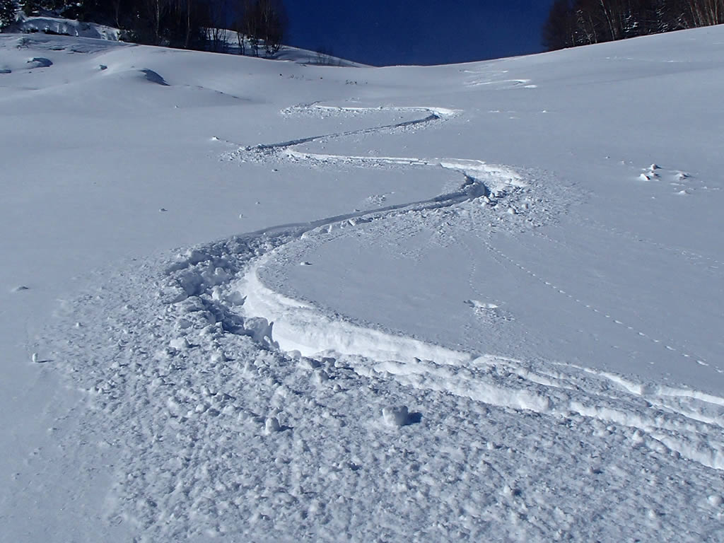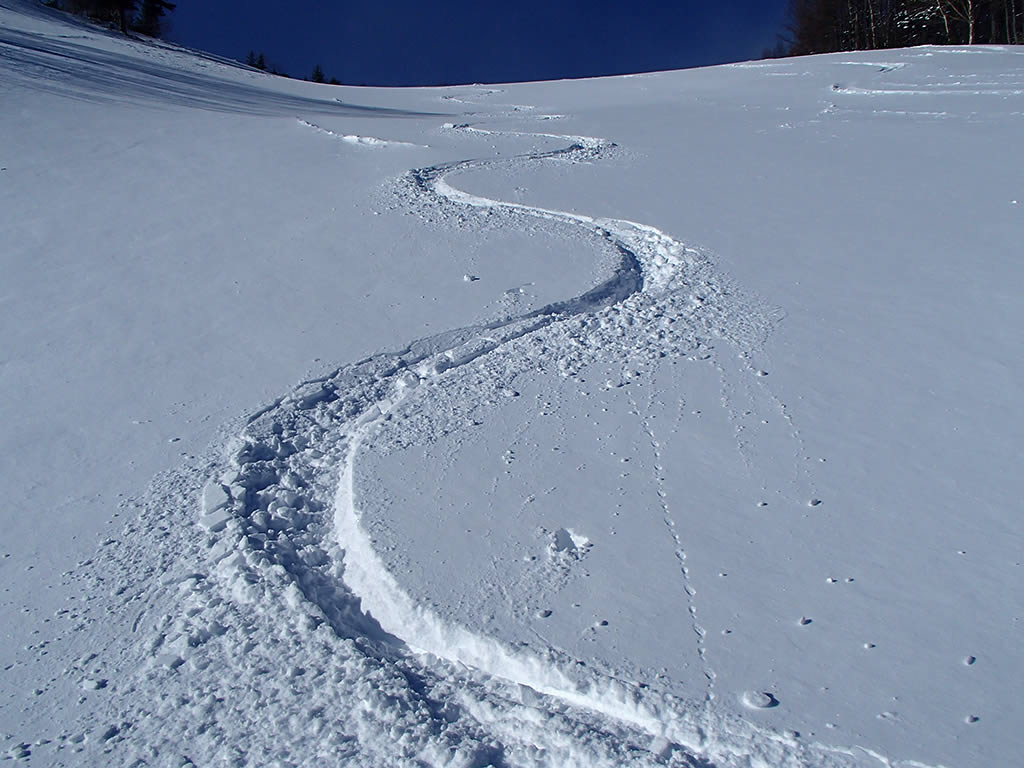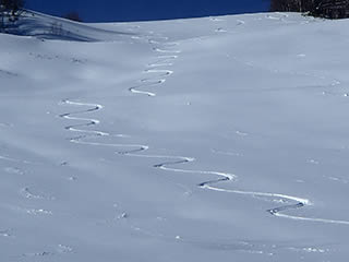 やはり上部の平坦な部分は新雪がうっすらでしたが、少し下ると吹き溜まって来ました。