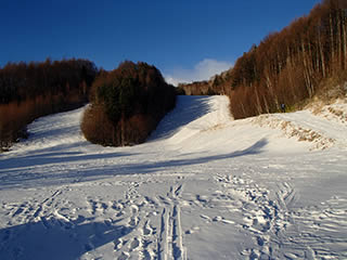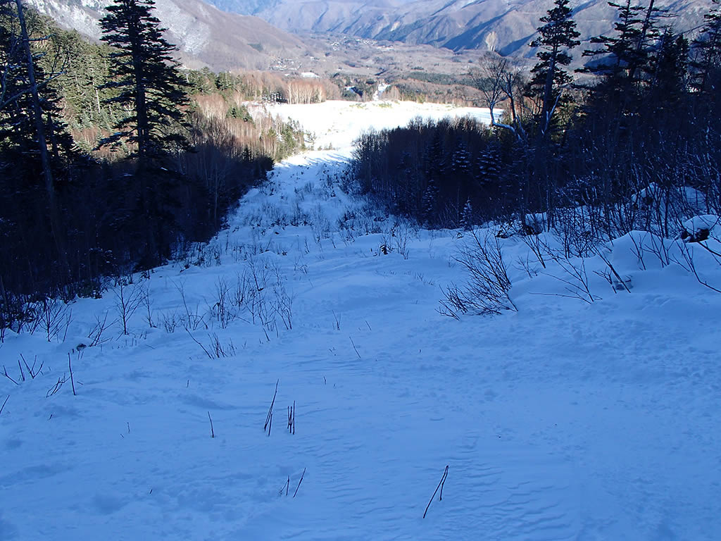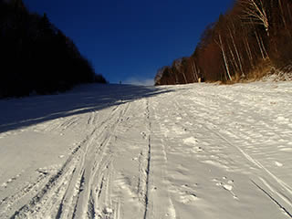 かもしかゲレンデ。今回はうっすらパウダーとクラストのまだら模様です。