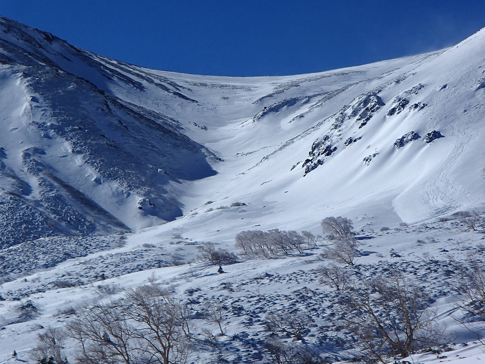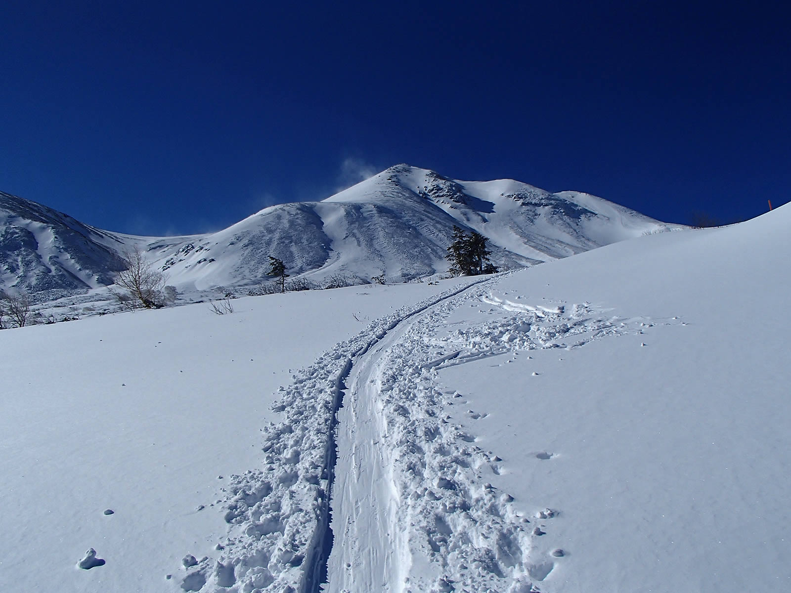 朝日岳。よく見たら斜面にシュプールがうっすら見えていますが、少し堅そうです。