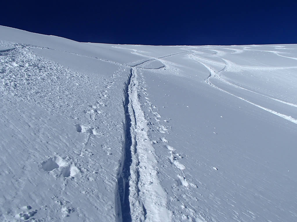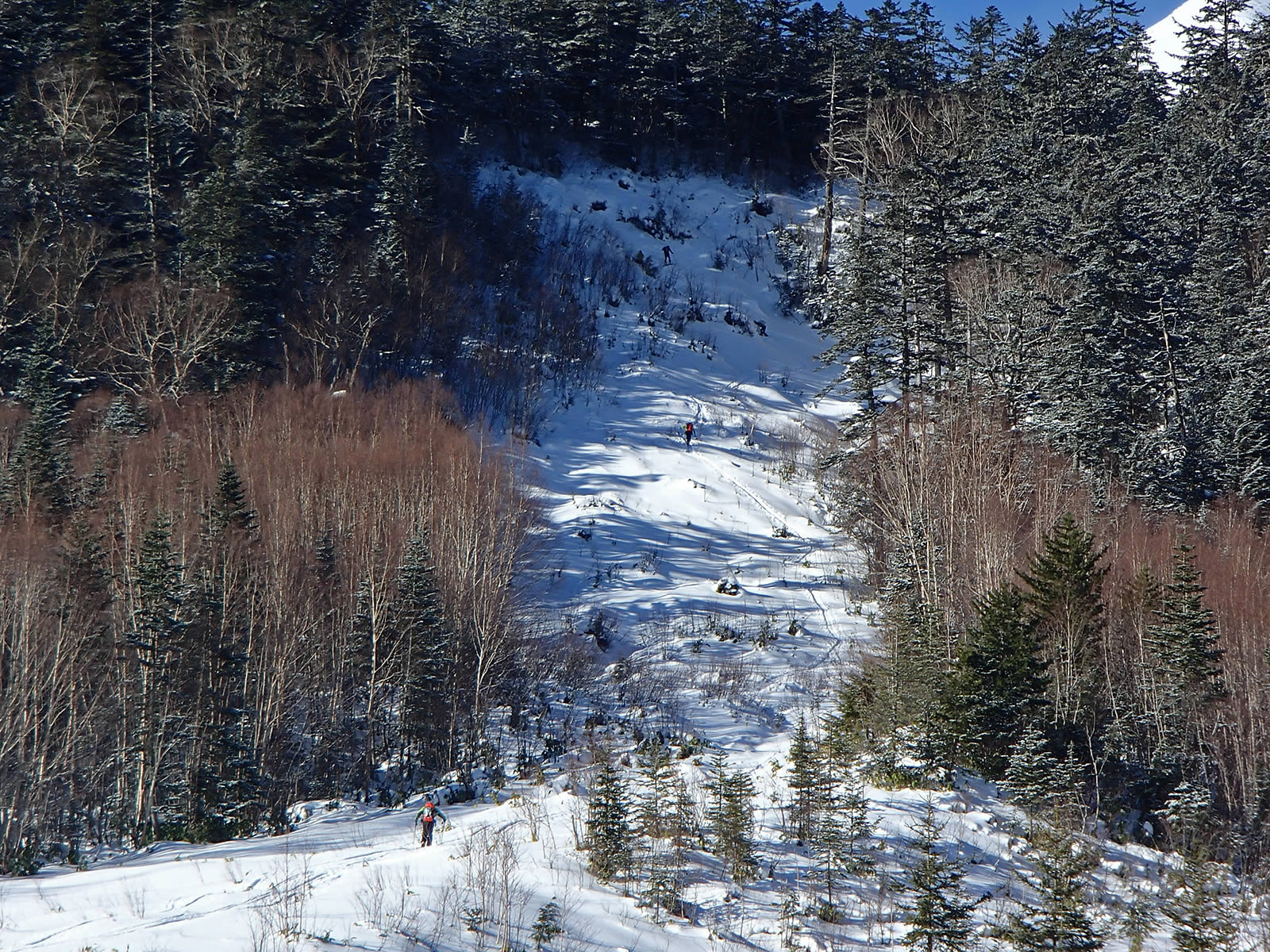 富士見沢。雪は多いです。ただ、少しパック気味に見えたのと、登り返しの時間を考えて今回は富士見沢は見送ることにしました。富士見沢は次回のお楽しみにします。