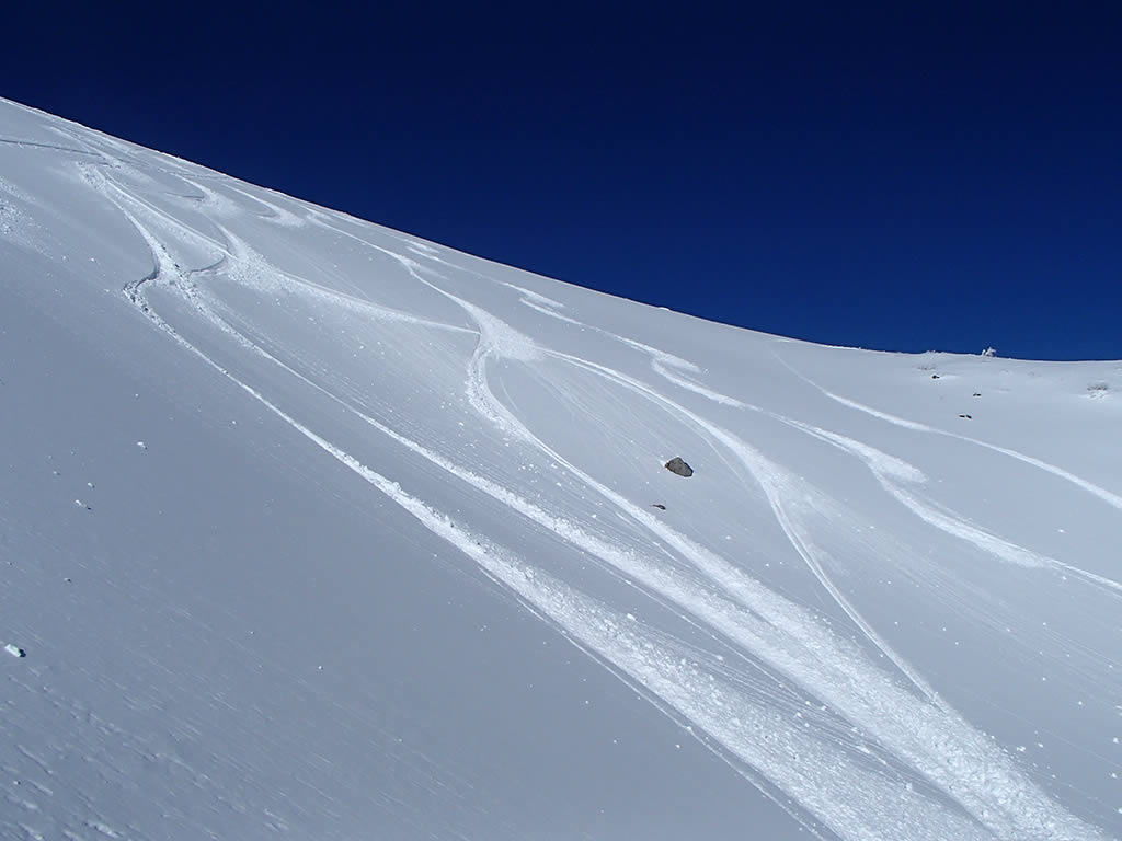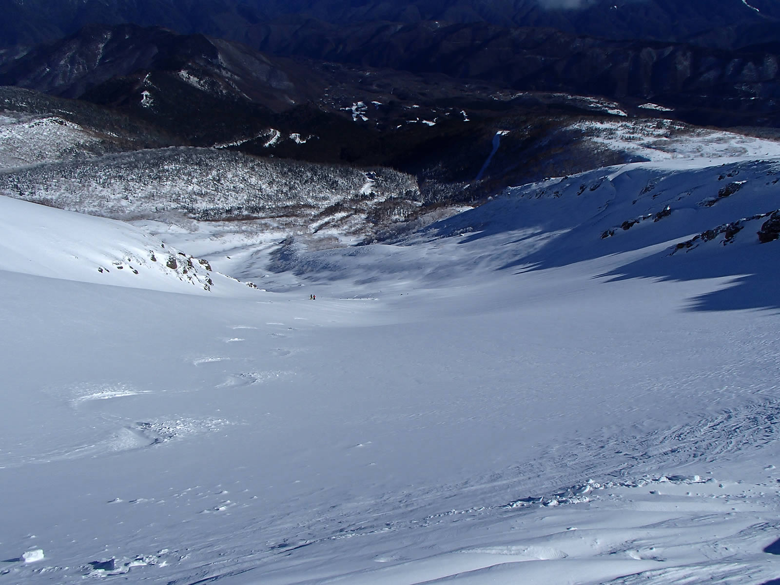 滑り台斜面上部まで戻り、12時33分、では摩利支天岳滑り台斜面を滑り始めます。