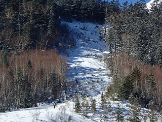 滑る予定の摩利支天滑り台。シュプールがだんだんと増えてきました(^^;。
