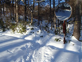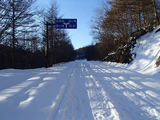 ではこれで帰ります。三峰茶屋までシールで来て、この先は駐車場までスキーで滑り降ります。ただしこの先で少し道路を歩きました(^^;。
