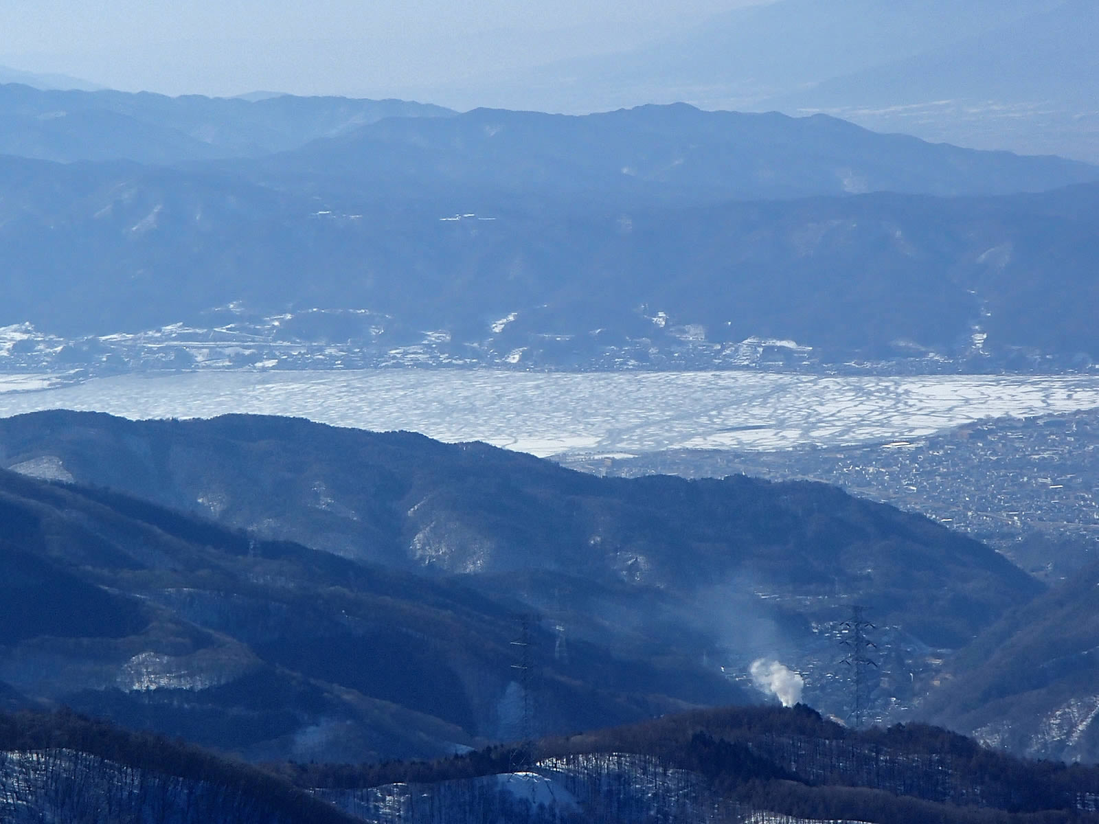 中央アルプス方面。全面結氷している諏訪湖も見えています。