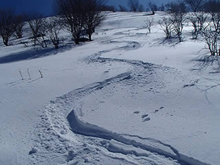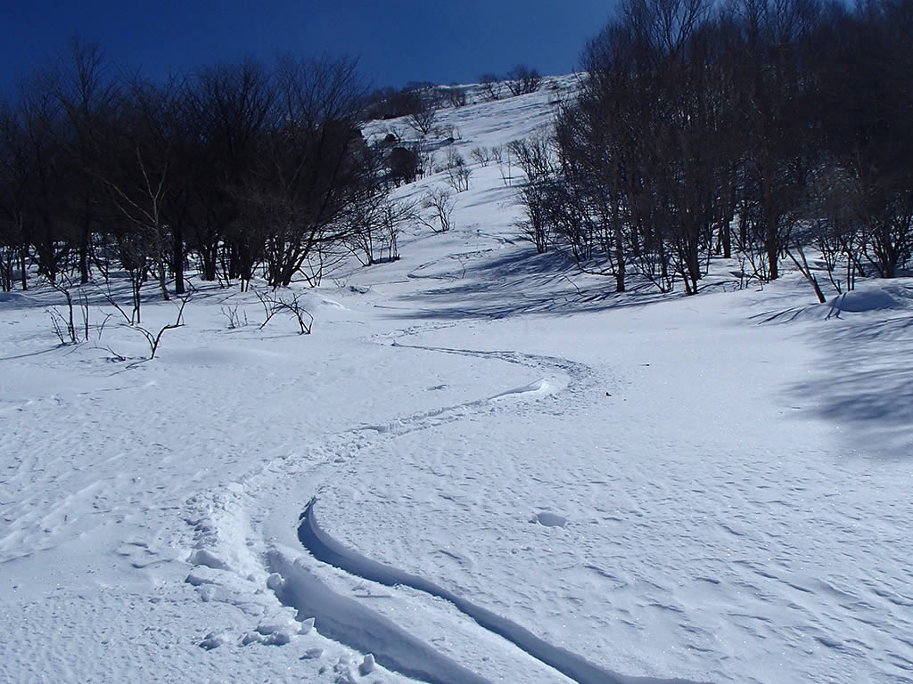 最近ほとんど降雪が無いせいで稜線の雪はかちかちでしたが、北面の中間から下の部分には柔らかい雪が吹き溜まっていて、プチパウダーを楽しむことが出来ました。