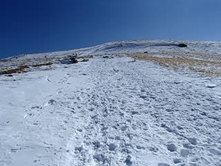 それなら西側の斜面も滑ってみようと登り始めますが、こちらは一番下のなだらかな部分以外は風にたたかれて堅い雪でした。