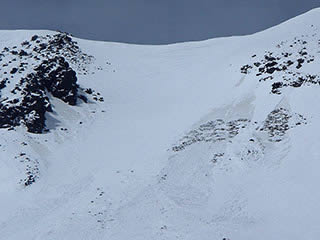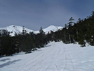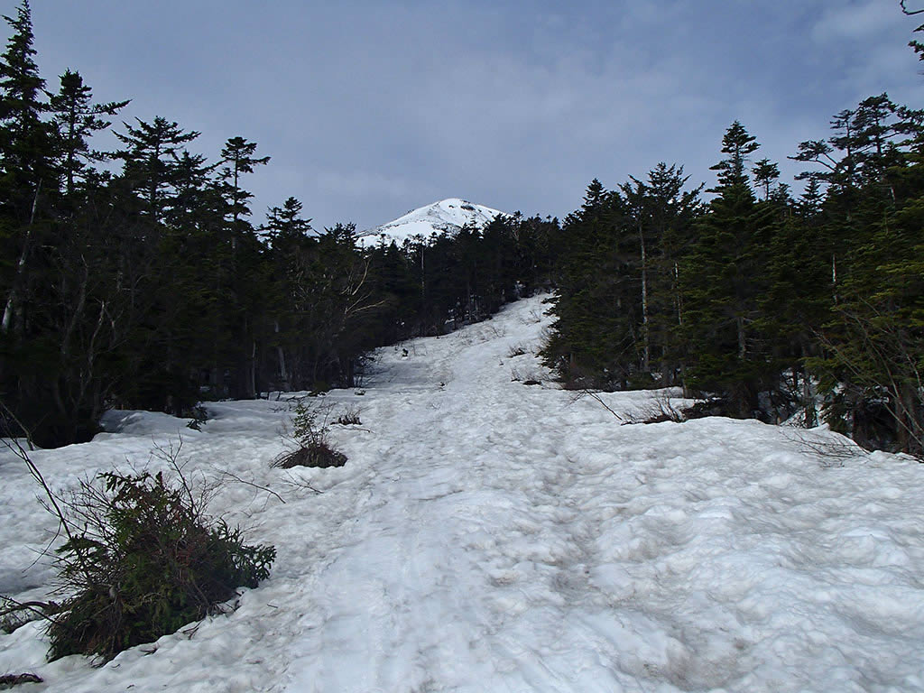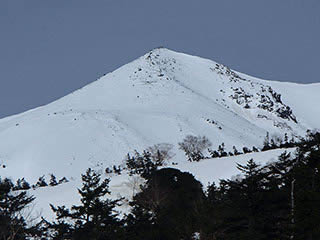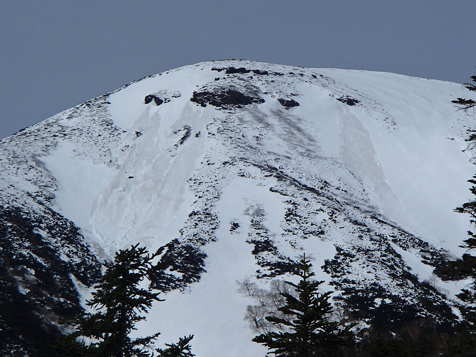 剣ヶ峰をズーム。あちこちで雪崩れた跡がありますね。今日の雪の状態がちょっと心配になります。