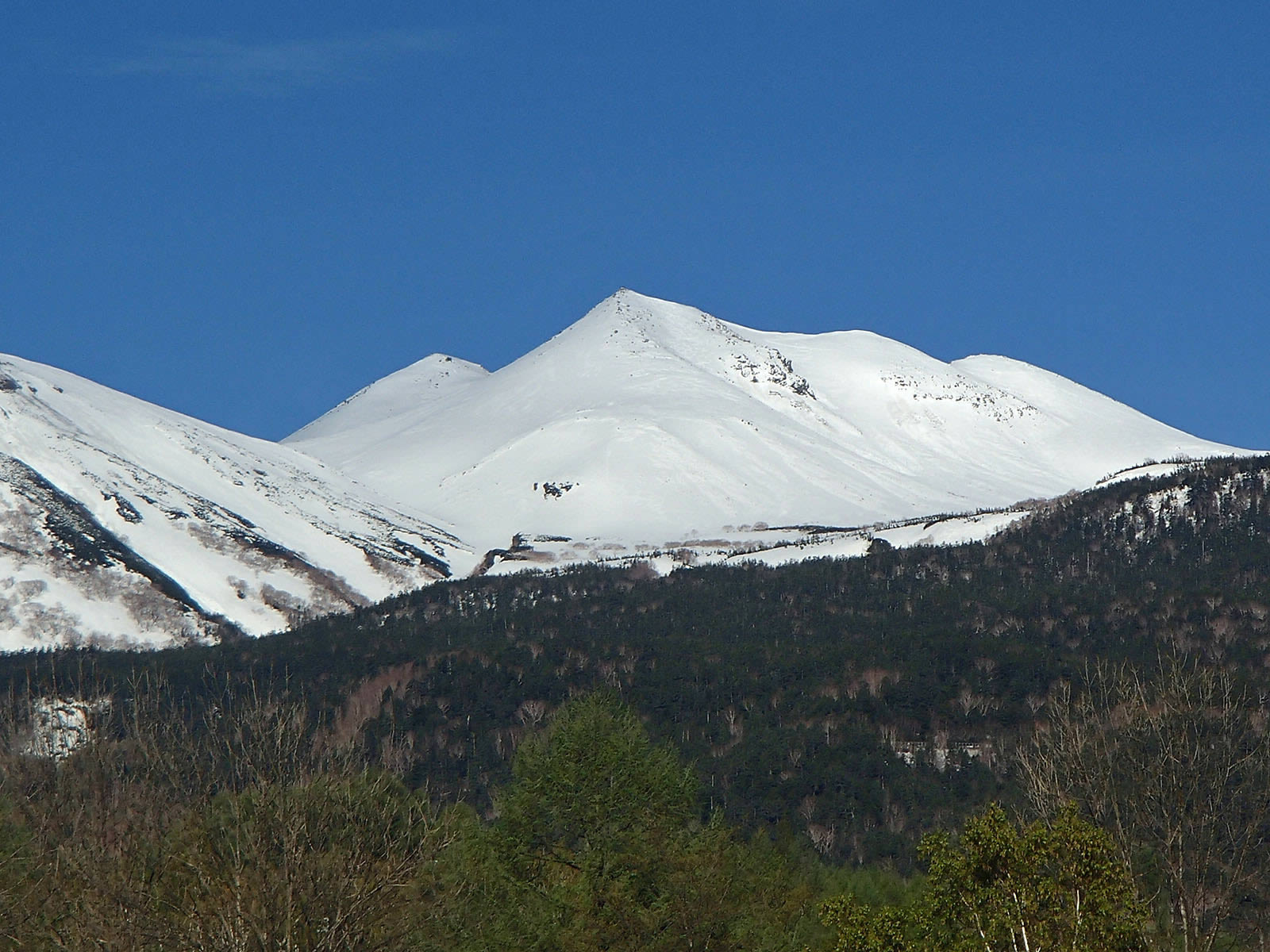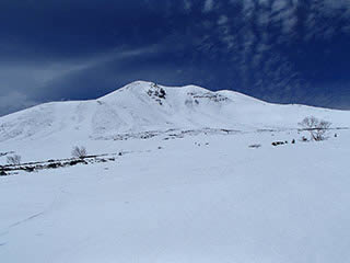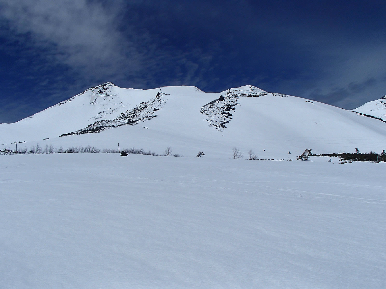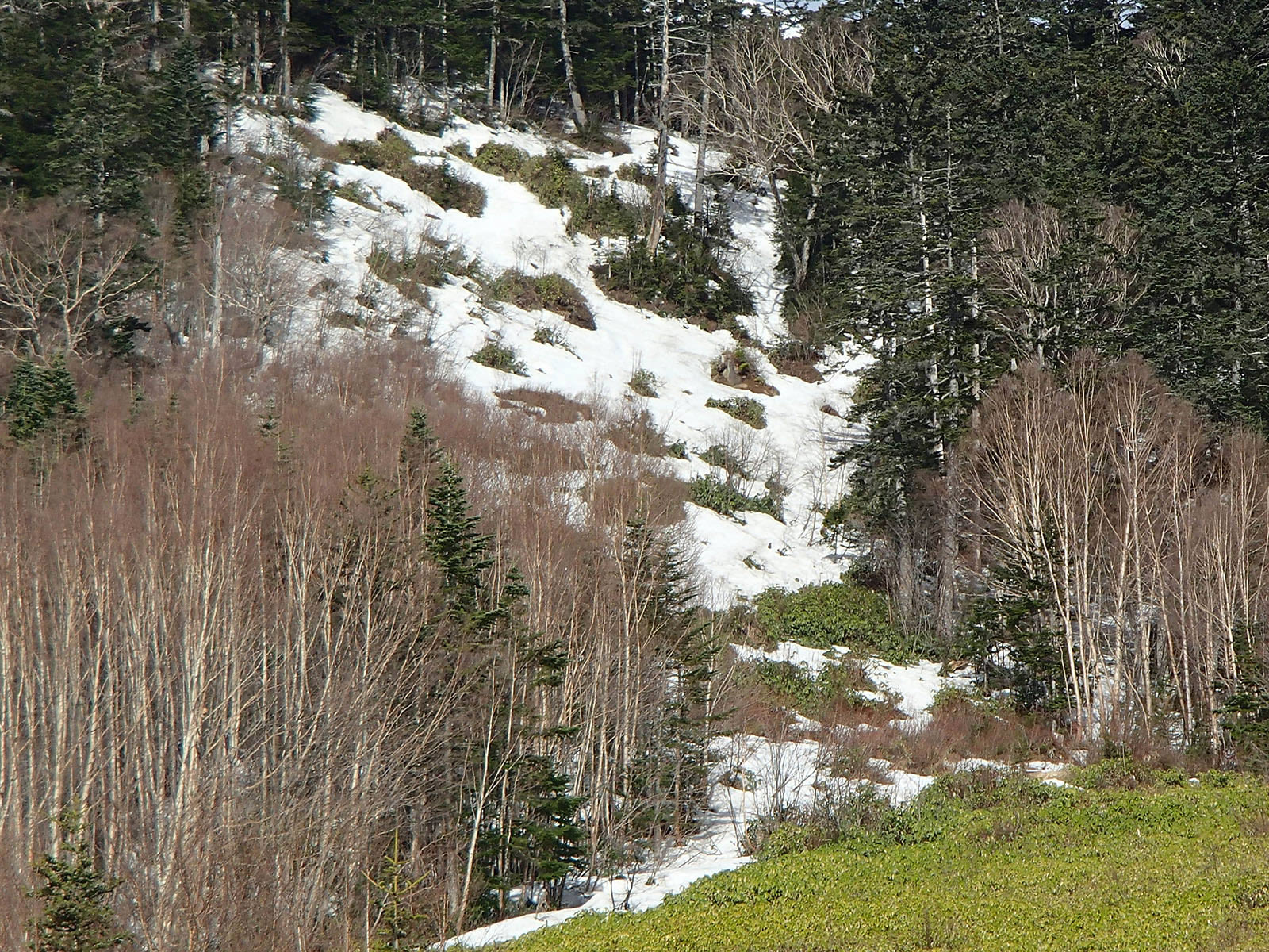 朝日岳の斜面。最近の降雪で再び真っ白になっています。