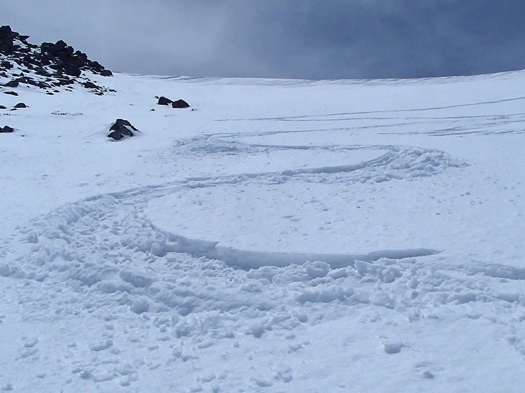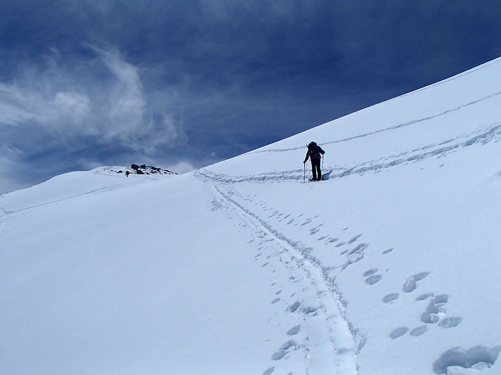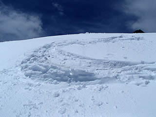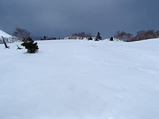 柔らかいザラメ状の新雪が20cmほど積もっています。ただ斜面の下を見ると多くの人が登ってきていましたので、万一雪崩れるとまずいと思い、この斜面は諦めました(^^;。